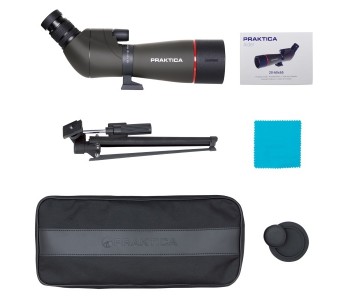 Комплектація підзорних труб Praktica Alder включає штатив, що дуже зручно, оскільки використання труби без штатива практично неможливо. Варто відзначити можливість повороту труби навколо своєї поздовжньої осі при установці на штатив. Таким чином, немає необхідності постійно вести спостереження з верхньої позиції. Спостерігач може розгорнути окуляр в сторону або вниз. Захисна бленда охоронить оптику від крапель дощу, або запобіжить небажані сонячні відблиски. На бленде знаходиться спеціальний цілик для попереднього наведення труби на ціль. Комплектацію труби доповнює наплічна сумка для транспортування труби і штатива, кришки об'єктива, окуляра і серветка для протирання оптики.