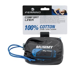 Вкладиш Ferrino Liner Comfort Light Mummy Blue - ідеальне рішення для підтримки особистої гігієни при короткочасних ночівлях в хостелах, поїздах, або на природі в спальному мішку. При використанні вкладиша зі спальним мішком досягається більший тепловий комфорт, але головне те, що немає необхідності стирати спальний мішок, який, як правило, вимагає більш делікатного догляду, досить тільки випрати вкладиш. Вкладиш пошитий з 100% бавовни - натурального гігієнічного матеріалу, який є комфортним і приємним для тіла, відмінно провітрюється і не електризується. Упакований в чохол, вкладиш не займе надто багато місця в рюкзаку, а завдяки петлі з текстильною застібкою Velcro, також може бути пристебнутий на рюкзак зовні.