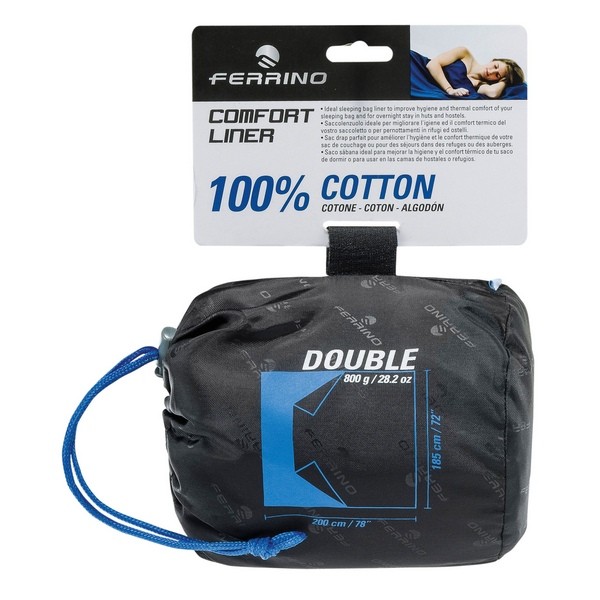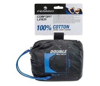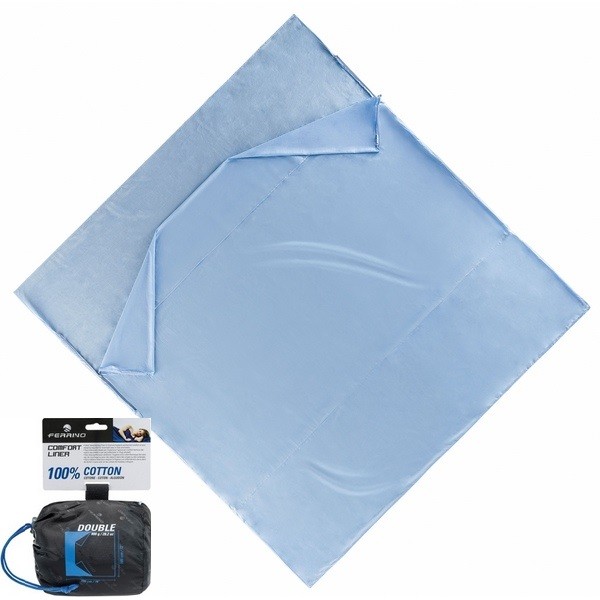 Вкладиш Ferrino Liner Comfort Double Light Blue розрахований на розміщення одночасно двох людей. Використання вкладиша - це ідеальне рішення для підтримки особистої гігієни при короткочасних ночівлях в хостелах, кемпінгах, або на природі в спальному мішку. При використанні вкладиша зі спальним мішком досягається більший тепловий комфорт, але головне те, що немає необхідності стирати спальний мішок, який, як правило, вимагає більш делікатного догляду, досить тільки випрати вкладиш. Вкладиш пошитий з 100% бавовни - натурального гігієнічного матеріалу, який є комфортним і приємним для тіла, відмінно провітрюється і не електризується. Упакований в чохол, вкладиш не займе надто багато місця в рюкзаку, а завдяки петлі з текстильною застібкою Velcro, також може бути пристебнутий на рюкзак зовні.