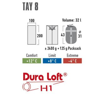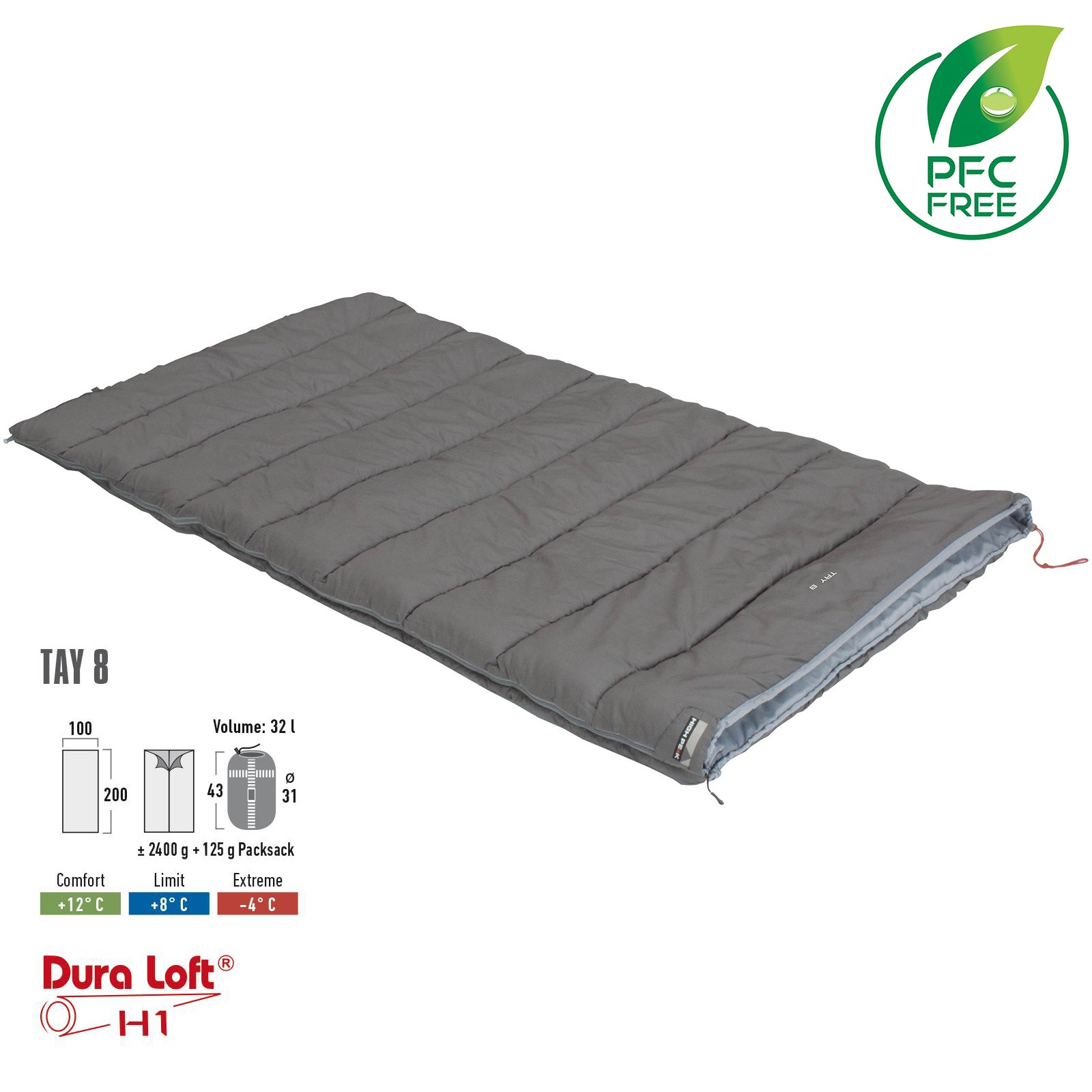 Екстрашірокій і екстрадлінний спальний мішок High Peak Tay 8 виконаний у формі ковдри і поставляється з компресійним чохлом в комплекті. Зовнішня оболонка і внутрішня підкладка виконані з найтоншої тканини, що складається з 65% поліестеру і 35% бавовни, і не містить PFC-з'єднань. Спальний мішок має високоякісний наповнювач Dura Loft® з чудовими ізоляційними властивостями. Матеріал Dura Loft® легко стискається, довговічний, зберігає тепло навіть у вологих умовах, швидко сохне. Спальний мішок High Peak Peak Tay 8 оснащений внутрішньою кишенею для зберігання цінних речей і довгою двосторонньої блискавкою з автоблокуванням, яка запобігає його відкриття під час сну. Застібка має ергономічну форму для зручного хвата рукою. Спальний мішок ідеально підходить для кемпінгу.