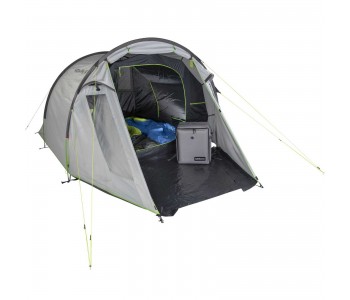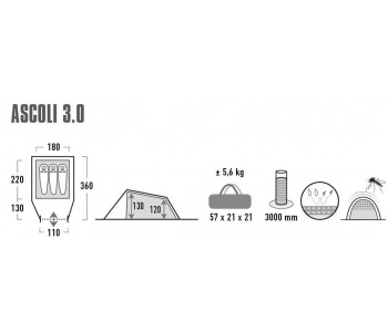 Двошарова тримісна тунельна палатка з навісом від сонця і дощу High Peak Ascoli 3.0 легко встановлюється завдяки кольоровому маркуванню дуг і підходить для сімейного відпочинку на вихідних. Просторий тамбур дозволяє розмістити всі ваші речі. Прозорі вікна з ПВХ наповнять світлом внутрішнє приміщення. Широке затемнене спальне місце і штори на вікнах гарантують комфортний сон не тільки вночі, але і при яскравому ранковому сонці. Регульовані вентиляційні вікна забезпечують циркуляцію повітря і позбавляють від конденсату, а москітна сітка на двері в спальню захищає від настирливих комах. Фірмова система вентиляції внутрішнього намету Vario Vent Control дозволяє регулювати надходження свіжого повітря в залежності від погодних умов за рахунок знімною стулки на двері. Тканина зовнішнього тенту має алюмінізірованной покриття для додаткової термоізоляції, і пройшла випробування за стандартом UV STANDARD 801 , забезпечуючи найбільш надійний захист від сонця на відкритому повітрі.