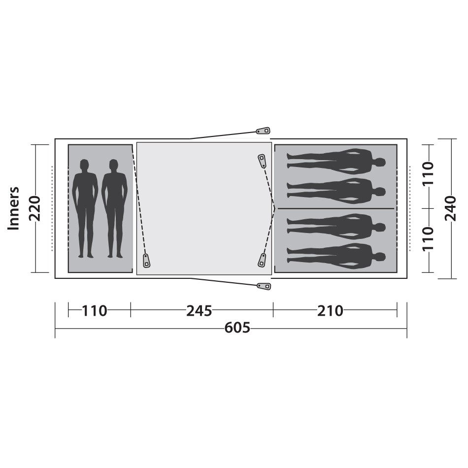 - Зовнішній тент (Д х Ш х В): 605 х 240 х 200 см