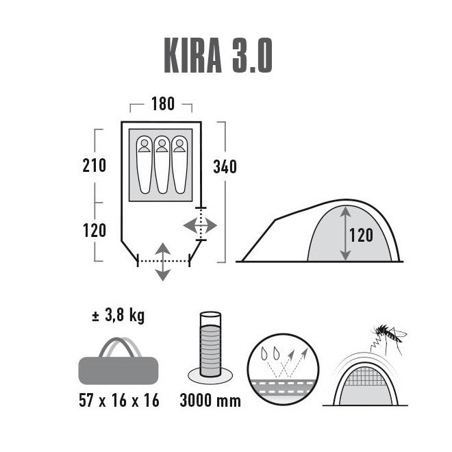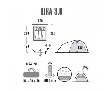 Оновлена модель популярною намети High Peak Kira 3.0 стане надійним супутником у ваших подорожах. Використання нових високоякісних матеріалів дозволило підвищити ступінь захисту відпочиваючого від шкідливого впливу ультрафіолетових променів відповідно до стандартом - UV STANDARD 801. Внутрішня частина тенту має спеціальне алюмінізірованной покриття яке забезпечує додаткову термоізоляцію. Ефективна система вентиляції VARIO VENT CONTROL на вході у внутрішній намет, забезпечує комфортний мікроклімат при будь-яких погодних умовах. Затемнена спальня дає можливість відпочити не тільки вночі, але і в денний час. Просторий тамбур на два входи в якому можна легко розмістити туристичний інвентар або організувати кемпінгову кухню. Антимоскітна сітка на вході в спальну кімнату. Модель High Peak Kira 3.0 стане хорошим вибором для використання як в базовому таборі, так і для сімейного відпочинку на природі.