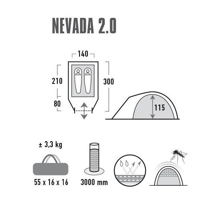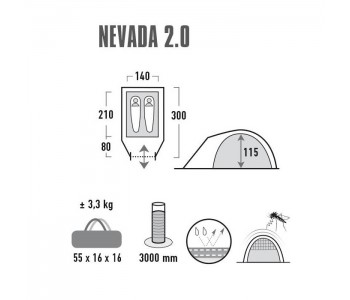 Оновлена модель High Peak Nevada 2.0 стане надійним супутником у ваших подорожах. Використання нових високоякісних матеріалів дозволило підвищити ступінь захисту відпочиваючого від шкідливого впливу ультрафіолетового світла відповідно до стандартом - UV STANDARD 801. Внутрішня частина тенту має спеціальне алюмінізірованной покриття, яке забезпечує додаткову термоізоляцію. Ефективна система вентиляції VARIO VENT CONTROL на вході у внутрішній намет, забезпечує комфортний мікроклімат при будь-яких погодних умовах. Затемнена спальня дає можливість відпочити не тільки вночі, але і в денний час доби. У тамбурі можна легко помістити туристичний інвентар. Антимоскітна сітка на вході в спальну кімнату. Модель намету High Peak Nevada 2.0 стане хорошим вибором для використання її, як в базовому таборі, так і для сімейного відпочинку на природі.