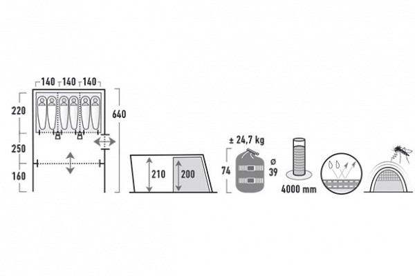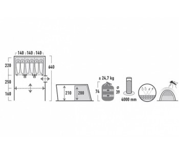 Кемпінгова 6-ти місний намет, з розділяються спальним відсіком на три секції. Намет має достатню висоту, для того, щоб більшість людей змогли пересуватися в ній, не пригинаючи голови. Тунельна конструкція надає найбільший корисний об'єм по відношенню до ваги намети. У просторому тамбурі з навісом від сонця або дощу вільно можна розміститися для відпочинку всім користувачам намети, влаштувати похідну кухню або додаткові спальні місця. Всі шви дна і тенту намету проклеєні спеціальною стрічкою, гарантуючи при цьому захист від проникнення вологи в дощову погоду. Фірмова система вентиляції Vario Vent Kontrol подбає про комфортне мікрокліматі в жарку пору року.