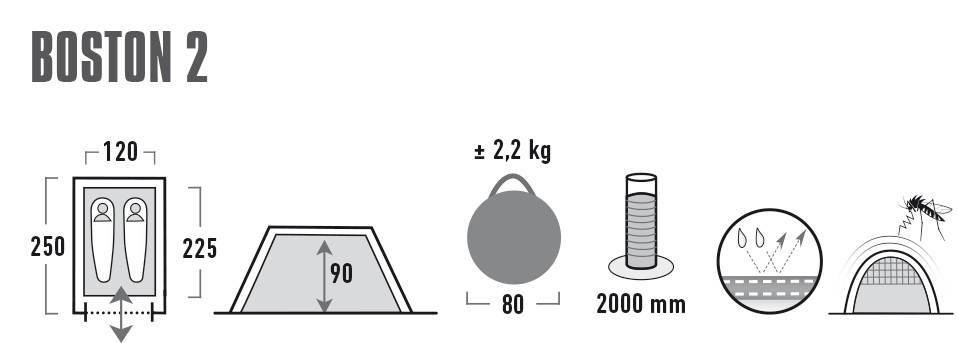 Легка двошаровий, 2-ох місний намет High Peak Boston має революційно нову конструкцію, яка сприяє простий і швидкого встановлення вироби. Внутрішня частина тенту має спеціальне алюмінізірованое покриття для ідеального відображення тепла в спекотні сонячні дні. Всі шви дна і тенту намету проклеєні спеціальною стрічкою, гарантуючи при цьому захист від проникнення вологи в дощову погоду. Вентиляційний клапан, антимоскітна сітка, кишені для дрібних речей створять комфортне перебивання в наметі.
