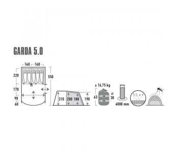 Новинка 2021 года! High Peak Garda 5.0 - сімейна тунельна палатка з двома входами, вітальні зі вшитим підлогою, який забезпечує захист від настирливих комах і небажаних протягів. Великий інтегрований навіс з прозорими вікнами створює тінь і допомагає запобігти потраплянню дощу всередину при відкриванні дверей. Передню стінку можна згорнути, щоб збільшити корисну площу намети. Житлова зона з висотою стелі 2,1 м дозволяє стояти в повний зріст, а також має достатньо місця для розміщення кемпінгових стільців, столу і похідного спорядження. Фронтальні сітчасті двері з клапаном на блискавці забезпечують постійний приплив свіжого повітря в намет. Бічна сітчаста двері збільшує приплив свіжого повітря і захищає від комах. Прозорі вікна в житловій зоні наповнять приміщення світлом, а штори при необхідності забезпечать самоту. Дах має тепловідбивне алюмінізірованной покриття, що знижує підвищення температури всередині намету днем в сонячну погоду.