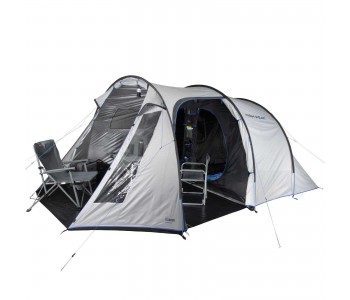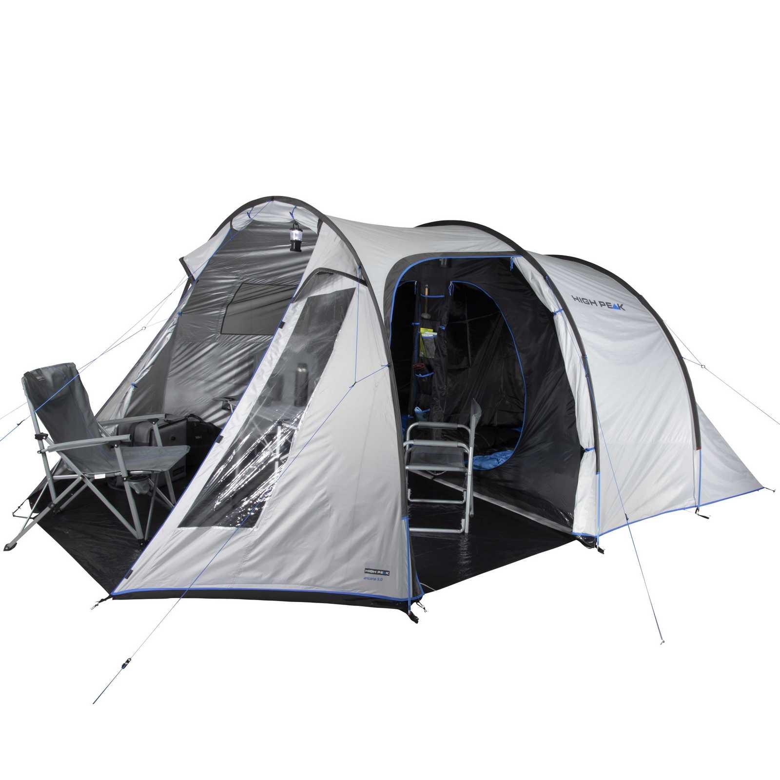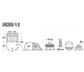 Двошарова чотиримісна тунельна палатка High Peak Ancona 4.0 підійде для сімейного відпочинку і туристів, що цінують комфорт. Простора житлова зона зі знімним підлогою дозволяє розмістити всі ваші речі і сховатися всередині в дощову погоду. Наявність двох входів робить зручним доступ до намету. Прозорі вікна з ПВХ і велике сітчасте вікно з шторою наповнять світлом внутрішнє приміщення. Широке затемнене спальне місце зі знімною перегородкою гарантує комфортний сон не тільки вночі, але і при яскравому сонці. Вентиляційні вікна і москітна сітка на дверях в спальню забезпечать приплив свіжого повітря і захист від настирливих комах. Тканина зовнішнього тенту має алюмінізірованной покриття для додаткової термоізоляції, а також пройшла випробування за стандартом UV STANDARD 801 , забезпечуючи найбільш надійний захист від сонця на відкритому повітрі.