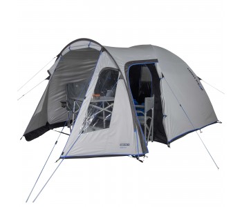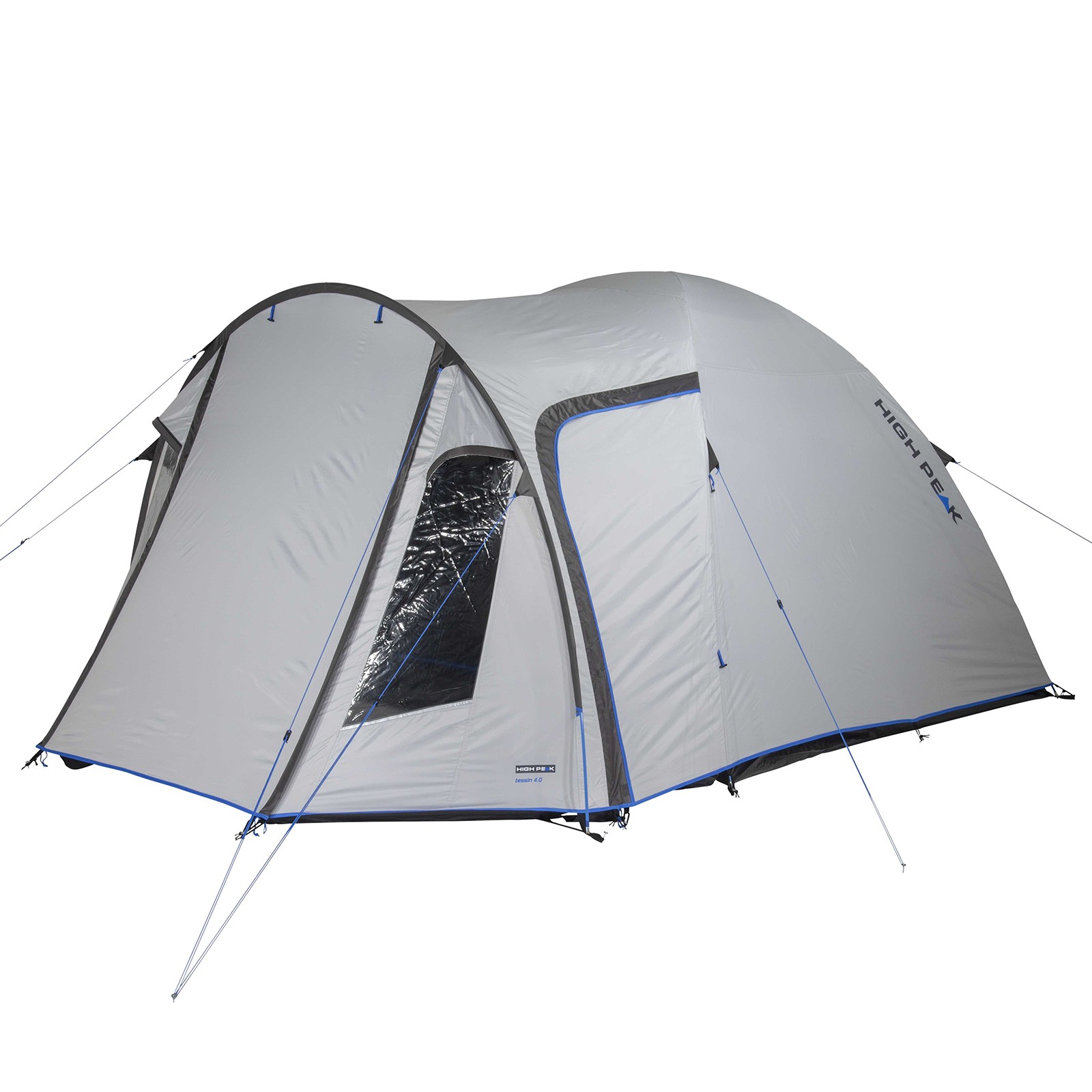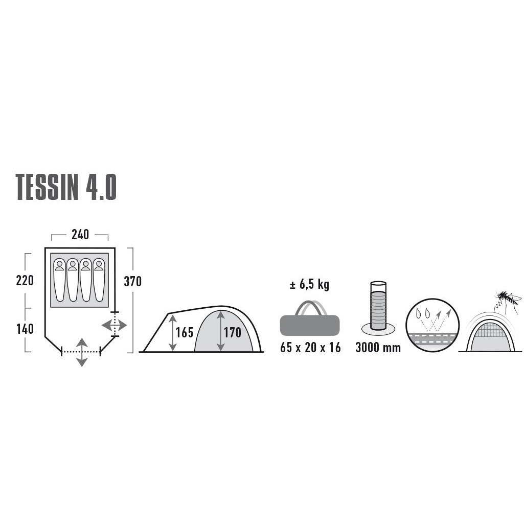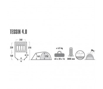 Двошарова чотиримісна купольна палатка з тунельним тамбуром High Peak Tessin 4.0 легко встановлюється і підходить для сімейного відпочинку на вихідних. Просторий тамбур дозволяє розмістити всі ваші речі, а наявність двох незалежних входів робить зручним доступ до намету. Прозорі вікна з ПВХ наповнять світлом внутрішнє приміщення. Широке затемнене спальне місце гарантує комфортний сон не тільки вночі, але і при яскравому сонці. Регульовані вентиляційні вікна і москітна сітка на двері в спальню забезпечать приплив свіжого повітря і захист від настирливих комах. Тканина зовнішнього тенту має алюмінізірованной покриття для додаткової термоізоляції, і пройшла випробування за стандартом UV STANDARD 801 , забезпечуючи найбільш надійний захист від сонця на відкритому повітрі.