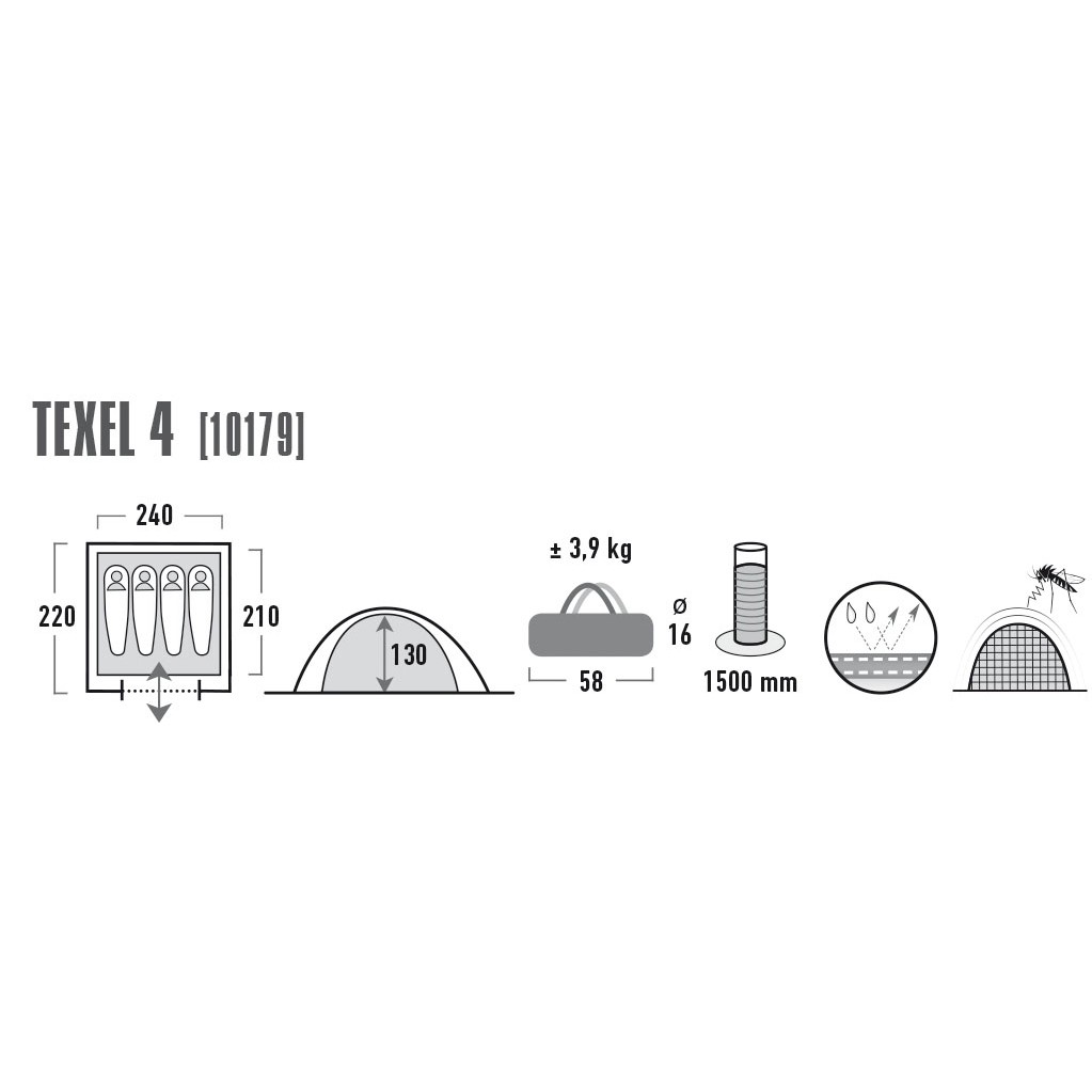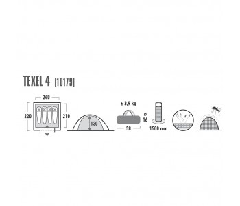Двошарова чотиримісна купольна палатка High Peak Texel 4 легко встановлюється і підійде для кемпінгу на вихідних. Широке спальне місце гарантує комфортний сон після активного дня. Вентиляційний клапан і москітна сітка на вході забезпечать приплив свіжого повітря і захист від настирливих комах.