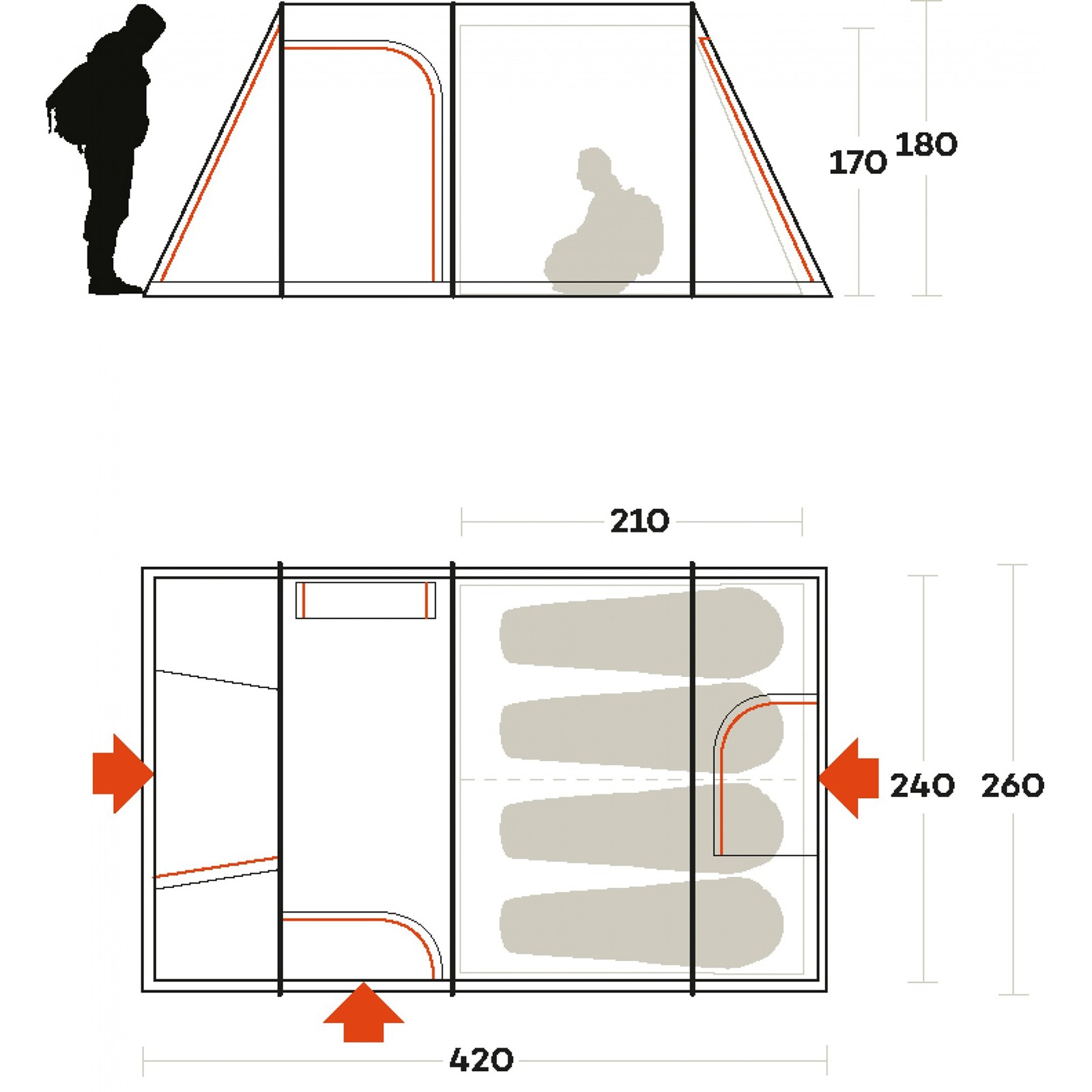 Бічний вхід у зовнішній тент і вхід у внутрішній намет оснащені москітною сіткою.