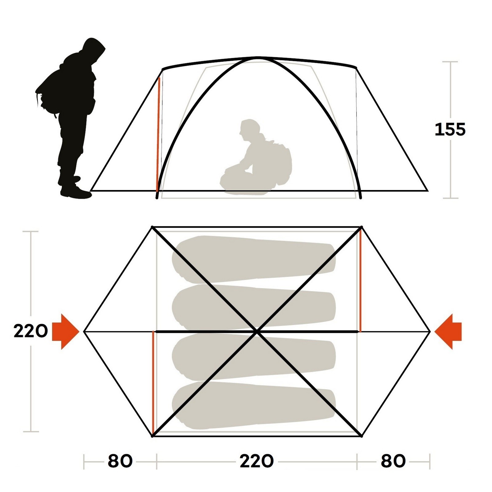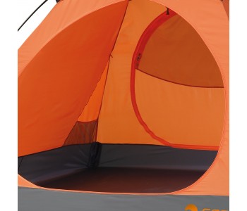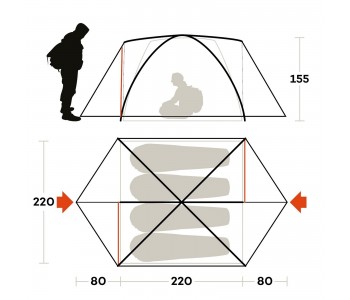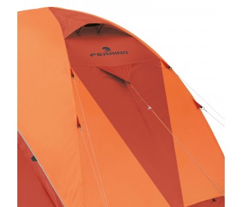 Намет Lhotse 4 (8000) Orange відноситься до серії четирехсезонних наметів Ferrino і рекомендована для походів середньої і підвищеної складності в якості компактної, але високою чотиримісній намети в базовому таборі. Про те, що дана намет може використовуватися в несприятливих погодних умовах каже двошаровий конструкція з внутрішньої наметом з тканини, збільшена кількість штормових відтяжок з подвійною фіксацією, збільшена товщина дуг каркаса, продумана система вентиляції, снігозахисна спідниця, та й сам колір намети, сприяє більш простий ідентифікації на будь-якому рельєфі. Разом з тим можливість окремої установки внутрішнього намету дає можливість використовувати дану модель і жарким літом. Схема розміщення людей в наметі і наявність двох тамбурів і двох входів дозволяє комфортно користуватися наметом, абсолютно не обмежуючи один одного. Установка такого намету в гарну погоду не вимагає фіксації кілочками і розтяжками. Мініатюрна конструкція обумовлює стійкість намети до значних вітрових навантажень. Водозахист зовнішнього тенту становить 3000 мм в. ст., а підлоги - 8000 мм в. ст., що в рази перевищує нормативні вимоги до водозахисним наметів і чого цілком вистачає, щоб зберегти намет всередині сухий під час тривалих опадів середньої і високої інтенсивності. Чохол намети має компресійні стяжки, що дозволяє домогтися дуже компактних розмірів упакованої намети.