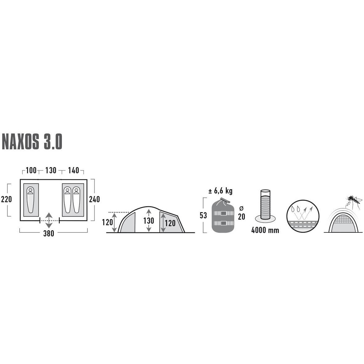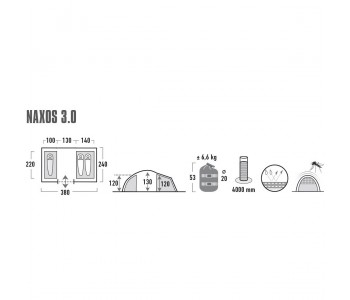 кемпінгового намету High Peak Naxos 3.0 стане надійним супутником у ваших подорожах. Ефективна система вентиляції VARIO VENT CONTROL на входах у внутрішні намети, забезпечує комфортний мікроклімат при будь-яких погодних умовах. Два окремі, затемнені спальні дають можливість відпочити не тільки вночі, але і в денний час доби. Просторий тамбур дозволяє легко розмістити туристичний інвентар. Антимоскітні сітки на вході в спальний відділ, проклеєні шви, водозахист від дощу в 4000 мм і багато іншого дозволять використовувати намет повноцінно як у базовому таборі, так і для сімейного відпочинку на природі.