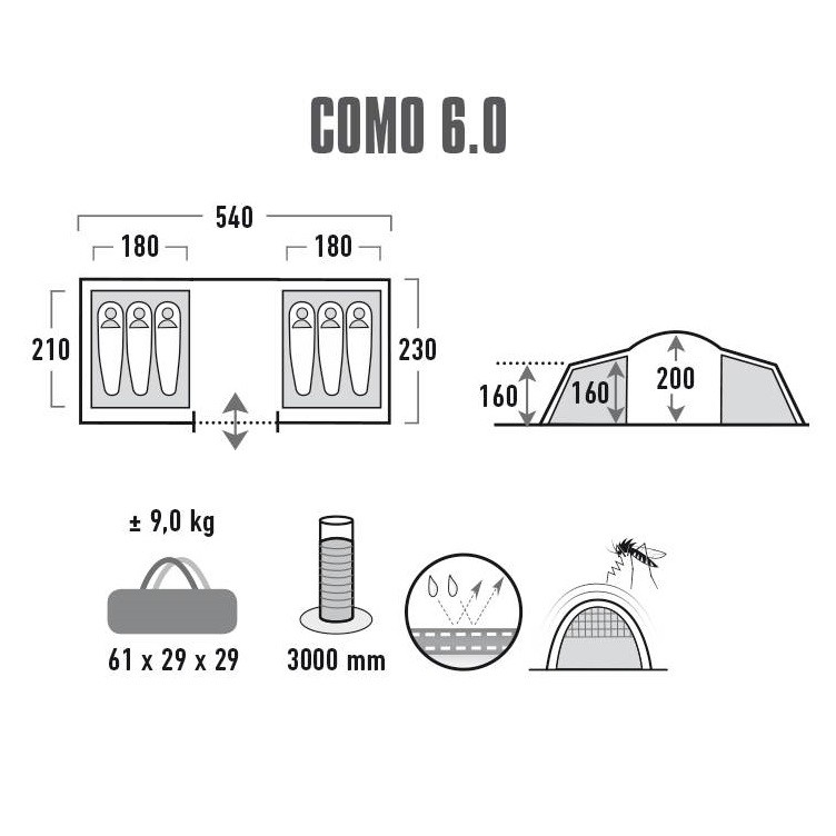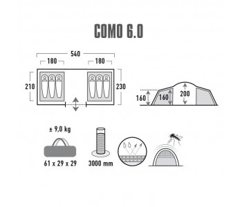 Оновлена модель кемпінгового намету High Peak Como 6.0 стане надійним супутником у ваших подорожах. Використання нових високоякісних матеріалів дозволило підвищити ступінь захисту відпочиваючого від шкідливого впливу ультрафіолетових променів відповідно до стандартом - UV STANDARD 801. Внутрішня частина тенту має спеціальне алюмінізірованной покриття, яке забезпечує додаткову термоізоляцію. Ефективна система вентиляції VARIO VENT CONTROL на входах у внутрішні намети, забезпечує комфортний мікроклімат при будь-яких погодних умовах. Два окремі, затемнені спальні дають можливість відпочити не тільки вночі, але і в денний час доби. Просторий тамбур дозволяє легко розмістити туристичний інвентар або організувати кемпінгову кухню. Антимоскітні сітки на входах в спальну кімнату. Модель High Peak Como 6.0 стане хорошим вибором для використання, як в базовому таборі, так і для сімейного відпочинку на природі.