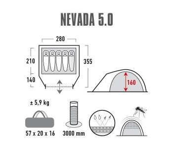 Оновлена модель High Peak Nevada 5.0 стане надійним супутником у ваших подорожах. Використання нових високоякісних матеріалів дозволило підвищити ступінь захисту відпочиваючого від шкідливого впливу ультрафіолетових променів відповідно до стандартом - UV STANDARD 801. Внутрішня частина тенту має спеціальне алюмінізірованной покриття, яке забезпечує додаткову термоізоляцію. Ефективна система вентиляції VARIO VENT CONTROL на вході у внутрішній намет, забезпечує комфортний мікроклімат при будь-яких погодних умовах. Затемнена спальня дає можливість відпочити не тільки вночі, але і в денний час доби. У тамбурі можна легко розмістити туристичний інвентар. Антимоскітна сітка на вході в спальну кімнату. Модель High Peak Nevada 5.0 стане хорошим вибором для використання, як в базовому таборі, так і для сімейного відпочинку на природі.