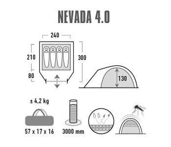 Оновлена модель High Peak Nevada 4.0 стане надійним супутником у ваших подорожах. Використання нових високоякісних матеріалів дозволило підвищити ступінь захисту відпочиваючого від шкідливого впливу ультрафіолетових променів відповідно до стандартом - UV STANDARD 801. Внутрішня частина тенту має спеціальне алюмінізірованной покриття, яке забезпечує додаткову термоізоляцію. Ефективна система вентиляції VARIO VENT CONTROL на вході у внутрішній намет, забезпечує комфортний мікроклімат при будь-яких погодних умовах. Затемнена спальня дає можливість відпочити не тільки вночі, але і в денний час доби. У тамбурі можна легко розмістити туристичний інвентар. Антимоскітна сітка на вході в спальну кімнату. Модель High Peak Nevada 4.0 стане хорошим вибором для використання, як в базовому таборі, так і для сімейного відпочинку на природі.