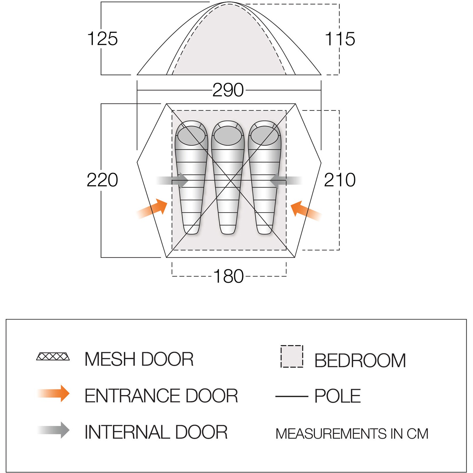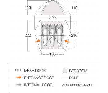 - Зовнішня намет (ДхШхВ): 220 х 290 х 125 см