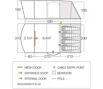 - Зовнішня намет (Д х Ш х В): 580 х 310 х 195 см