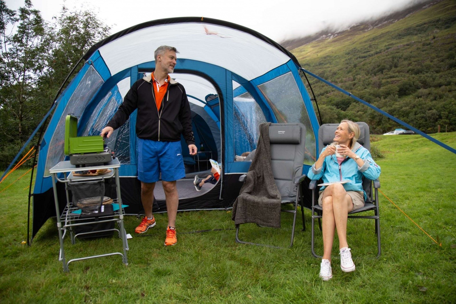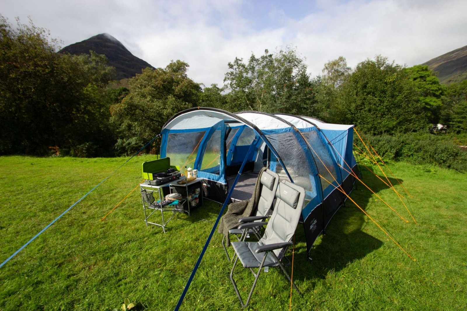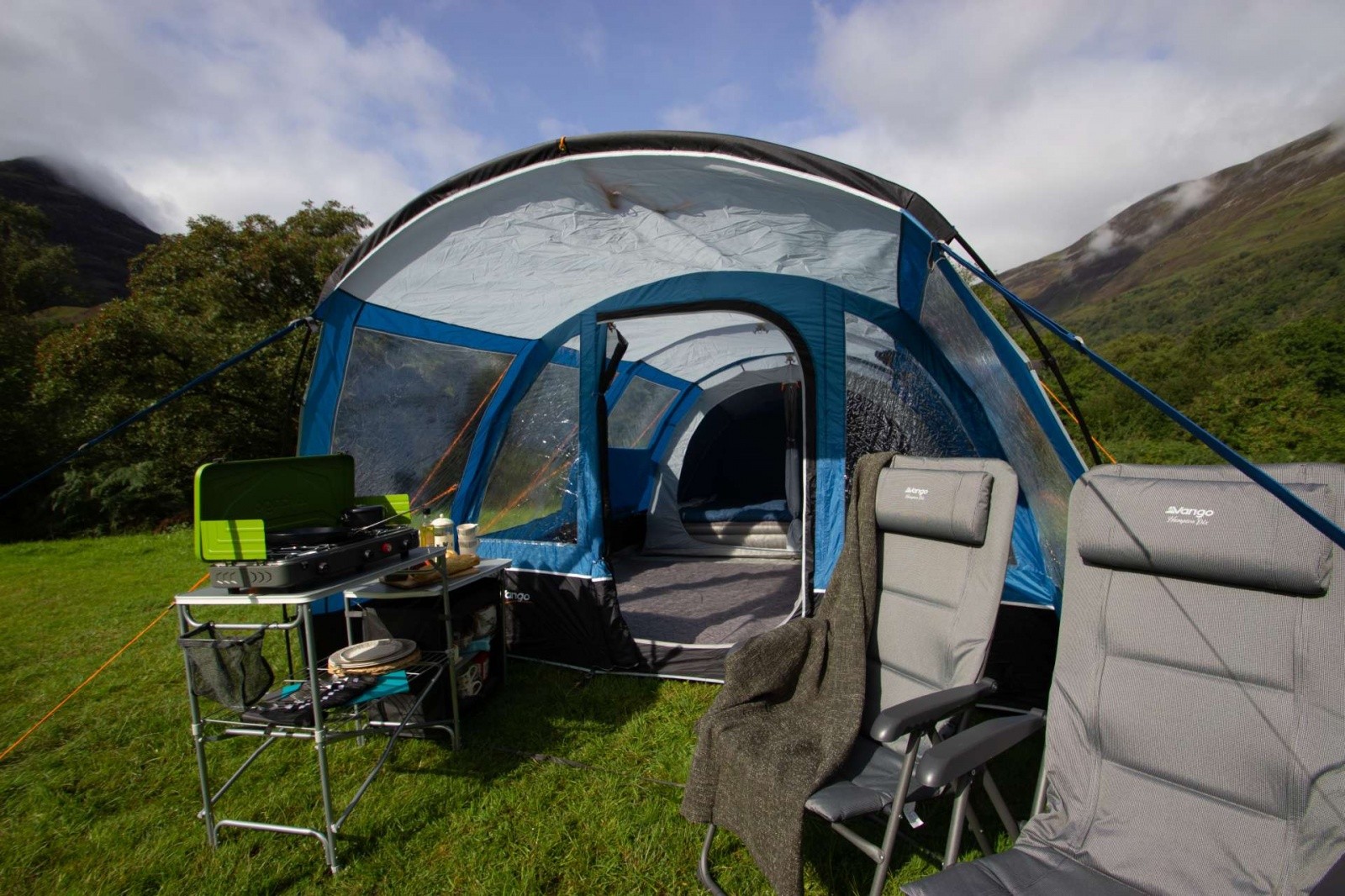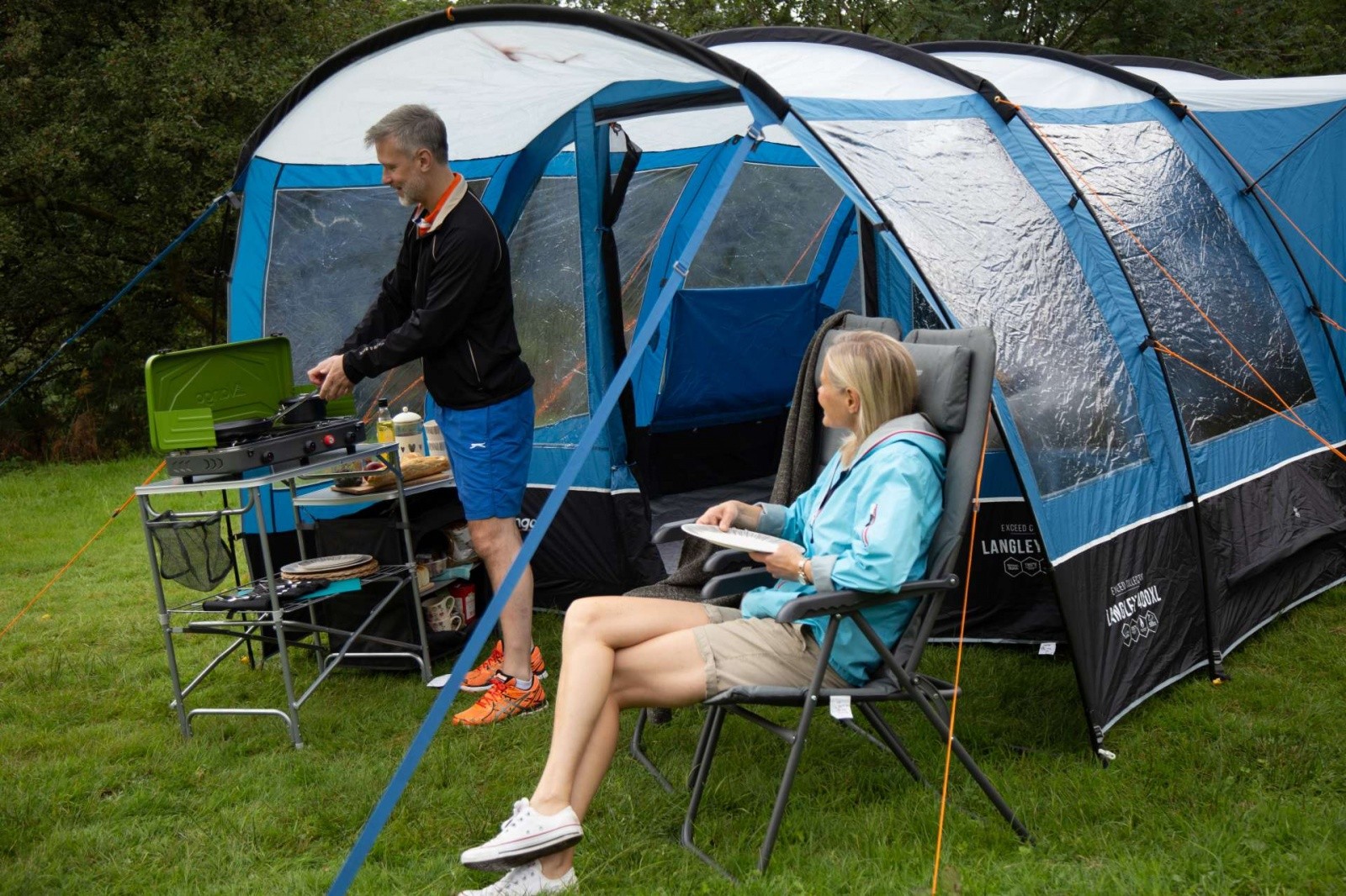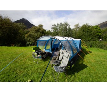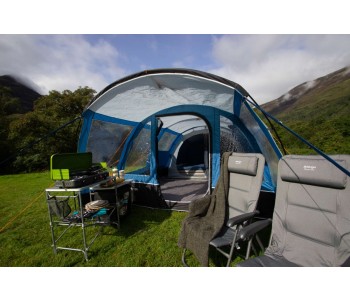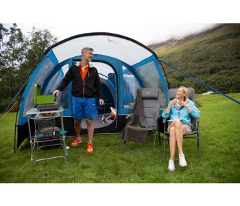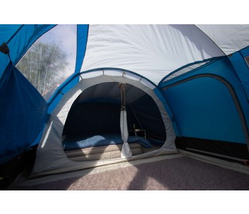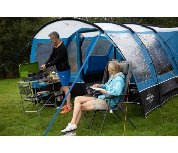 Модель Vango Langley 400XL Sky Blue - неймовірно просторий намет, яка по праву може називатися будинком на природі. Нова простора спальня Midnight Bedroom виконана з блокуючого сонячне світло матеріалу, який забезпечує міцний сон, а його дихаючі властивості створюють якісну циркуляцію повітря всередині спальні. Разом з тим намет має два критих входу, просторий тамбур і внутрішні перегородки спального приміщення за схемою 2 + 2, що забезпечує зонування простору і певний рівень приватності. Каркас намету складається з п'яти дуг Powerflex®, що підвищує міцність до вигинів при вітрових навантаженнях, а разом з Запатентованою системою TBS®II забезпечує жорсткість і надійність всієї конструкції. Зовнішній тент виготовлений з нової тканини Sentinel Dura, яка Була розроблена для поліпшення експлуатаційних характеристик тканини без додавання зайвої ваги. Технологія ColourLock c фільтром UPF30 + зберігає колір тканини на протязі тривалого часу і захищає від УФ-променів. Крім того, намет має досить високий рівень водозащити. Дана модель палатки пройшла випробування на безпеку Згідно Міжнародного стандарту ISO5912 .