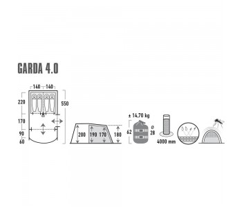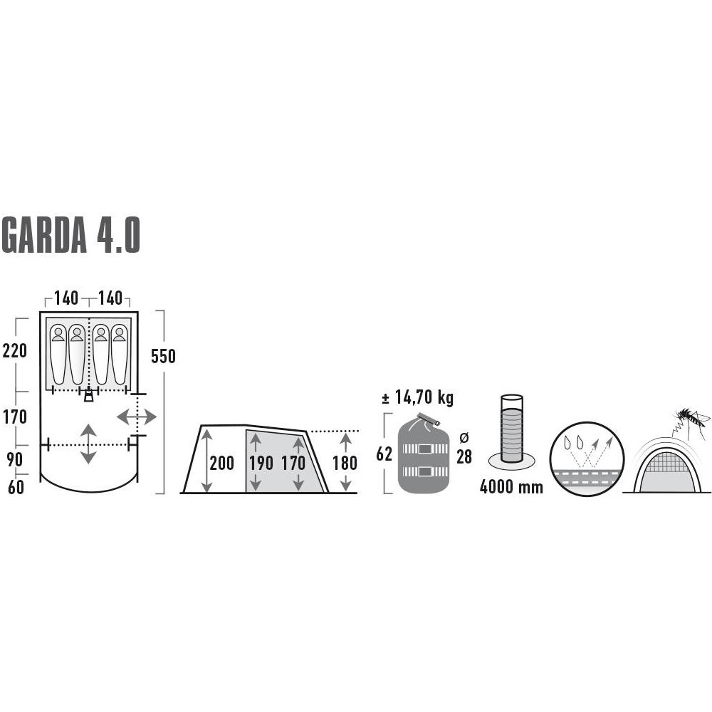 Новинка 2021 года! High Peak Garda 4.0 - сімейна тунельна палатка з двома входами, вітальні зі вшитим підлогою, який забезпечує захист від настирливих комах і небажаних протягів. Великий інтегрований навіс з прозорими вікнами створює тінь і допомагає запобігти потраплянню дощу всередину при відкриванні дверей. Передню стінку можна згорнути, щоб збільшити корисну площу намети. Житлова зона з висотою стелі 2 м дозволяє стояти в повний зріст, а також має достатньо місця для розміщення кемпінгових стільців, столу і похідного спорядження. Фронтальні сітчасті двері з клапаном на блискавці забезпечують постійний приплив свіжого повітря в намет. Бічна сітчаста двері збільшує приплив свіжого повітря і захищає від комах. Прозорі вікна в житловій зоні наповнять приміщення світлом, а штори при необхідності забезпечать самоту. Дах має тепловідбивне алюмінізірованной покриття, що знижує підвищення температури всередині намету днем в сонячну погоду.