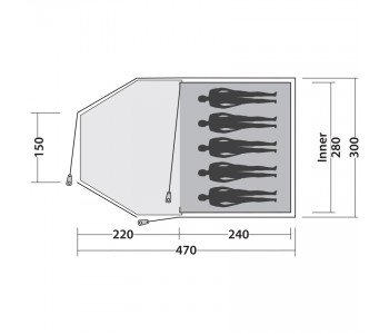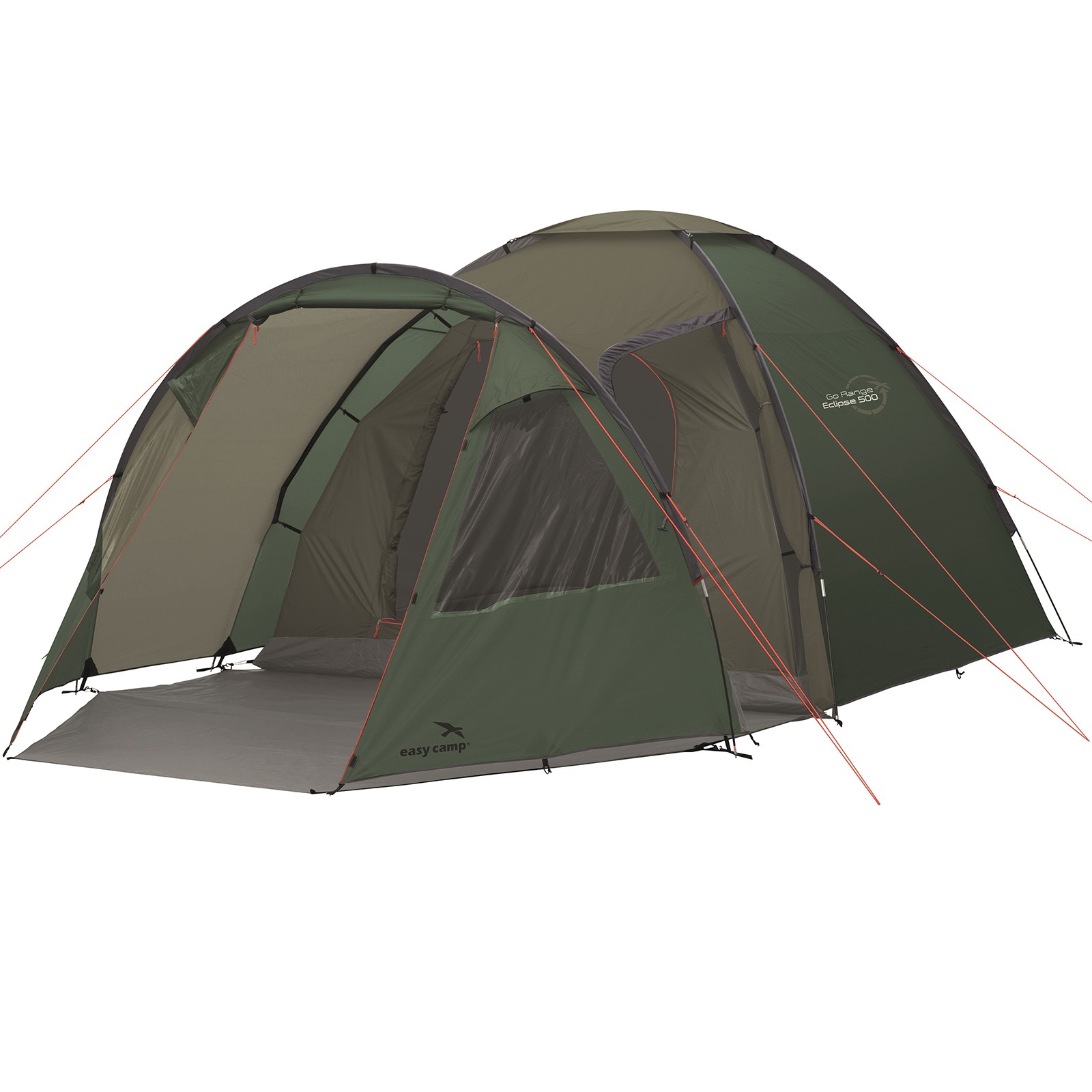 Easy Camp Eclipse 500 - купольна палатка з тунельним входом для комфортного сну п'ятьох людей. Третя дуга створює місткий тамбур зі знімним підлогою для розміщення велосипедів та зберігання інвентарю, необхідного для відпочинку на природі. Прозорі вікна наповнюють внутрішній простір світлом. Велика вхідні двері, а також двері збоку забезпечують зручний доступ всередину. Регульовані вентиляційні вікна у фронтальній і в верхній частині намети сприяють постійної циркуляції повітря. Внутрішній намет має D-образну двері з москітної сітки для захисту від комах і зручну точку підвісу для ліхтаря. Місткий тамбур і комфортна спальня в поєднанні з компактним розміром сумки-чохла роблять цей намет ідеальної для туристів, які подорожують на невеликому автомобілі.
