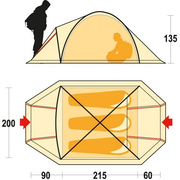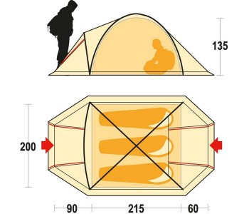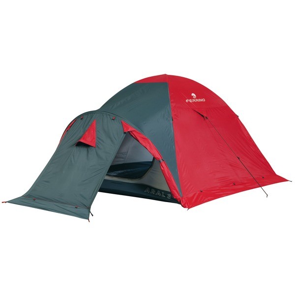 Намет Aral 3 (4000) Red /Gray відноситься до серії четирехсезонних наметів Ferrino і рекомендована для тривалих переходів середньої і підвищеної складності в пустелях або на піщаних грунтах. Про те, що дана намет може використовуватися в несприятливих погодних умовах пустель цілий рік, каже двошаровий конструкція з внутрішньої наметом з тканини з додатковою термоізоляцією для зими, можливість використання внутрішнього намету окремо від зовнішнього тенту влітку, посилений матеріал статі і металеві блискавки для мінімального зносу при контакті з піском, снігозахисна спідниця, що захищає від наметанія піску влітку і снігу взимку. Разом з тим всі ці особливості будуть корисні під час походів і в інших природних зонах. Дана модель пропонує більше простору спальної зони по довжині, ширині і висоті, ніж більшість наметів даного класу. Розташування людей в наметі, а також наявність двох окремих входів дозволяє комфортно користуватися наметом, абсолютно не обмежуючи один одного. Два тамбура, один з яких збільшений, здатні вмістити велику кількість спорядження. Мініатюрна конструкція обумовлює стійкість намети до значних вітрових навантажень. Водозахист зовнішнього тенту становить 3000 мм в. ст., а підлоги - 4000 мм в. ст., що більш ніж удвічі перевищує нормативні вимоги до водозахисним наметів і чого цілком вистачає, щоб зберегти намет всередині сухий під час тривалих опадів середньої інтенсивності. Чохол намети має компресійні стяжки, що дозволяє домогтися дуже компактних розмірів упакованої намети.