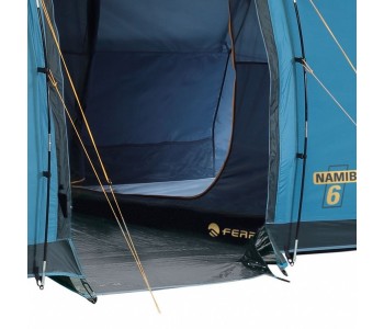 Намет Namib 6 Blue відноситься до серії сімейних наметів Ferrino, і є єдиною моделлю з двома повністю розділеними спальними приміщеннями, завдяки чому може використовуватися, як повноцінна намет на дві сім'ї. Важливим є те, що спальні місця розташовані не поперек, а уздовж осі намети, таким чином абсолютно всі жителі намети можуть їй користуватися не утрудняючи один одного. Ferrino Namib 6 Blue має найбільшим корисним внутрішнім об'ємом серед всієї лінійки і є повнорозмірною кемпінгових наметом, де більшість користувачів можуть вільно переміщатися в повний зріст. Обидва входи оснащені москітною сіткою і опускають бортами для зручності прибирання тамбура. У тамбурі Namib 6 Blue можна легко облаштувати невелику похідну кухню, розташувати додаткові спальні місця або розставити стільці для відпочинку. Чотири вентиляційних вікна з боків і великий вентиляційний вікно в куполі забезпечують природну циркуляцію повітря всередині. Москітні сітки внутрішніх наметів сприяють провітрювання і комфортному сну без комах. З огляду на двошарову конструкцію, двоточкову систему штормових відтяжок і наявність статі по всьому периметру намету, ступінь водозащити цілком достатня, щоб, при правильній установці, зберегти намет всередині сухий під час дощу. Обтічна форма і закрита конструкція зовнішнього тенту відмінно протистоїть вітровим навантаженням. Чохол намети закривається на блискавку, що дуже зручно при упаковці намети.