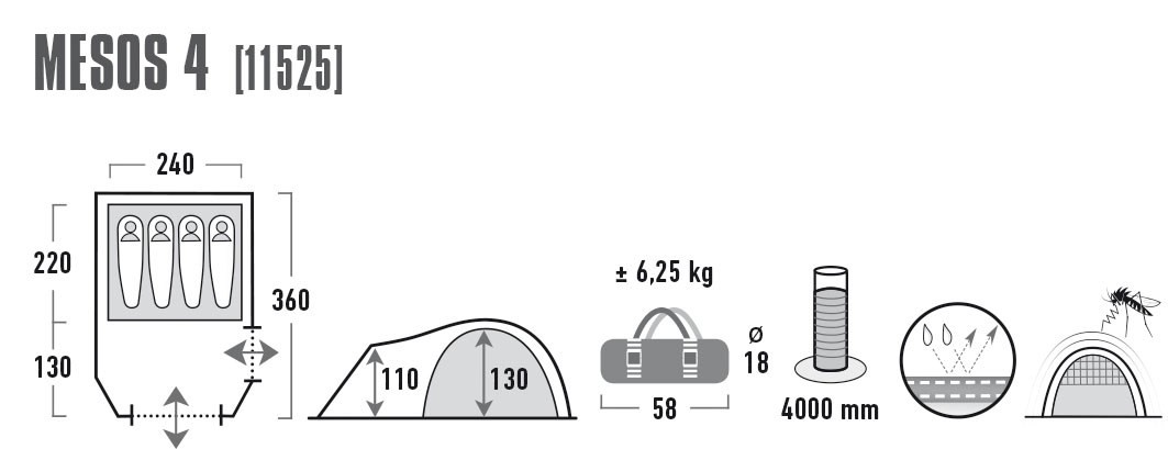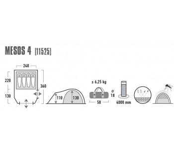 Покращена модель кемпінгових 4-ох місцевої намети High Peak Mesos. Намет обладнана покращеною системою вентиляції Vario Vent Kontrol яка подбає про комфортне мікрокліматі в жарку пору року. Просторий тамбур з підлогою ідеально підходить для розміщення спорядження. Наявність двох входів, дозволяє використовувати її як в базовому таборі, так і для сімейного відпочинку на природі. Антимоскітна сітка на вході в спальне відділення, проклеєні шви тенту, вікна з шторками забезпечують необхідний комфорт.