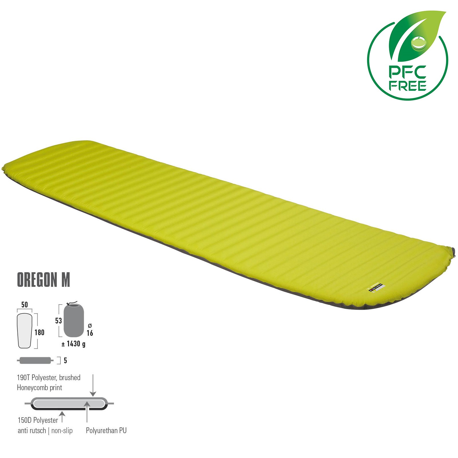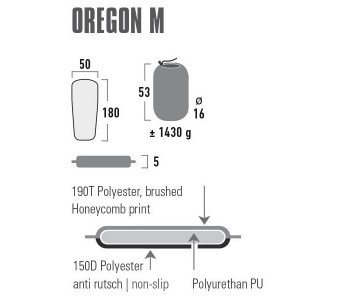 High Peak Oregon M - самонадувающийся туристичний килимок товщиною 5 см, з наповнювачем з поліуретанової піни високої щільності, що забезпечує чудову ізоляцію і комфорт під час сну. Верх з перфорацією Wave Cut ідеально прилягає до тіла і сприяє легкому складанню. Форма трапеції відрізняється простотою використання і економією ваги. Верх килимка виготовлений з високоякісної, нековзною і приємною для шкіри матової тканини з поліестеру 190T зі стильним принтом у вигляді сот, а низ - з міцного нековзкого поліестеру 150D. High Peak Oregon M оснащений високоякісним клапаном, який миттєво всмоктує повітря, заповнюючи піну для швидкого використання. При складанні повітря виходить швидше, що значно полегшує згортання. Килимок поставляється з двома компресійними ременями і чохлом для зберігання.
