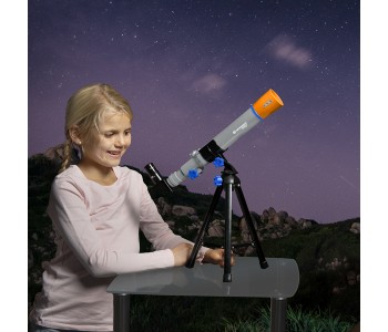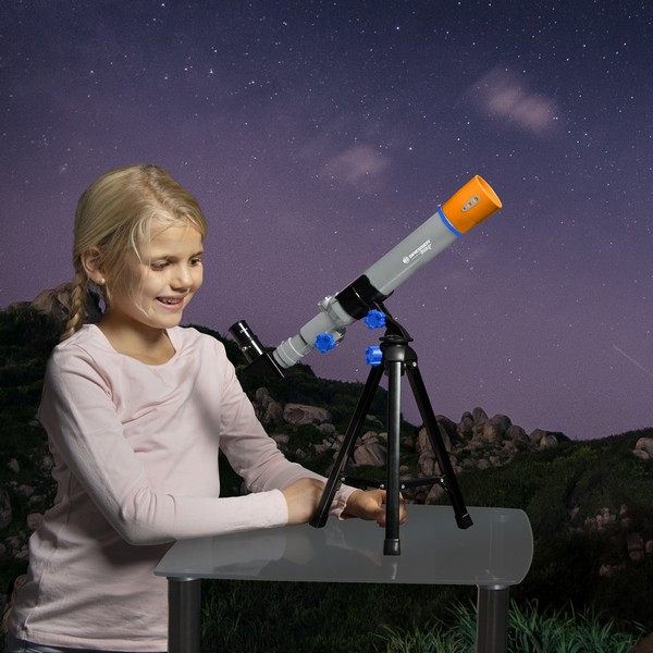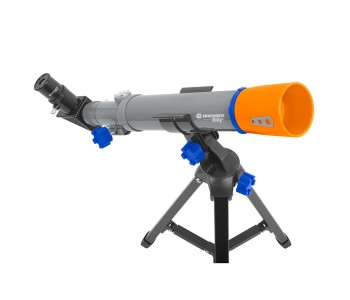 Телескоп Bresser Junior 40/400 AZ - це телескоп для самих маленьких астрономів. Він рекомендований для дитячого розвитку, починаючи з шести років. Його перевага саме в простоті використання, легкості і компактності. Дитина може проводити спостереження абсолютно без допомоги дорослих у дворі будинку, або навіть в квартирі, встановивши телескоп на підвіконня. Не дивлячись на те, що це дитячий телескоп, він має справжній скляний об'єктив з покриттям і набір з двох окулярів, що дозволяє спостерігати Місяць у всій її красі без особливих складнощів. А також телескоп можна використовувати у вигляді підзорної труби, що значно розширить коло ігор ребенка.Телескоп легко складається, і дитина завжди зможе його самостійно встановити і налаштувати, або скласти і зайнятися іншими заняттями. Це чудовий подарунок, здатний показати дитині те, про що він до цього тільки міг чути.
