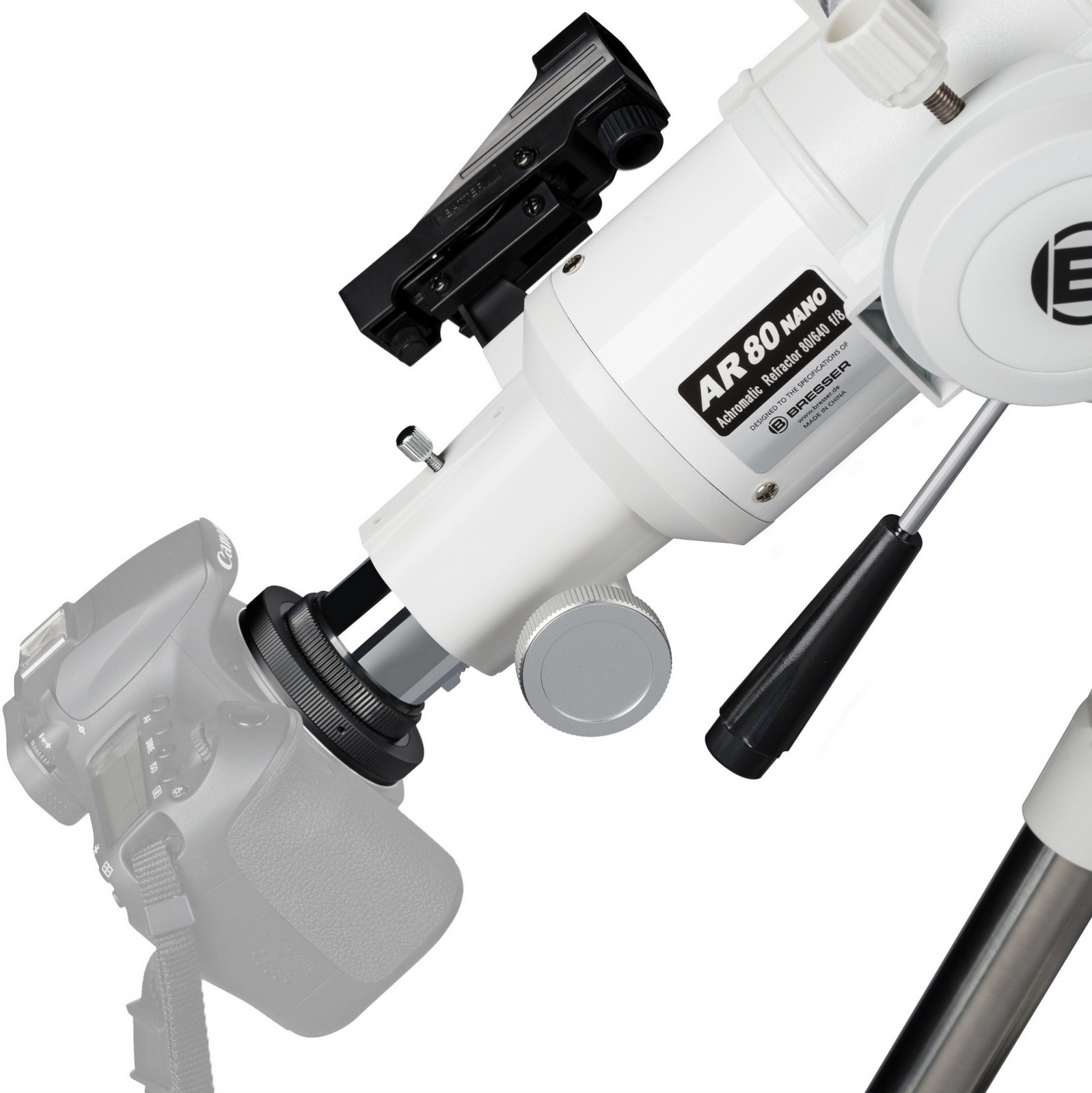 Телескоп Bresser Messier AR-80/640 Nano AZ є короткофокусної среднеапертурний рефрактор з якісною оптикою і нової азимутальной монтуванням Nano AZ, зручною для роботи з легкими трубами середньої апертури. Телескоп буде вельми цікавий для початківців користувачів, так як має ідеальний баланс між світлосилою і можливістю отримати достатню збільшення при роботі з якісним базовим окуляром. Модель відмінно підходить для спостереження об'єктів Сонячної системи, а також для наземних спостережень. Телескоп поставляється практично зібраним, і з необхідним набором аксесуарів для негайного старту спостережень. Телескоп дуже стійкий, так як поставляється в комплекті зі сталевою монтуванням. Цікавим аксесуаром в комплектації є адаптер для смартфона, за допомогою якого легко фотографувати об'єкти спостережень на камеру вашого смартфона.