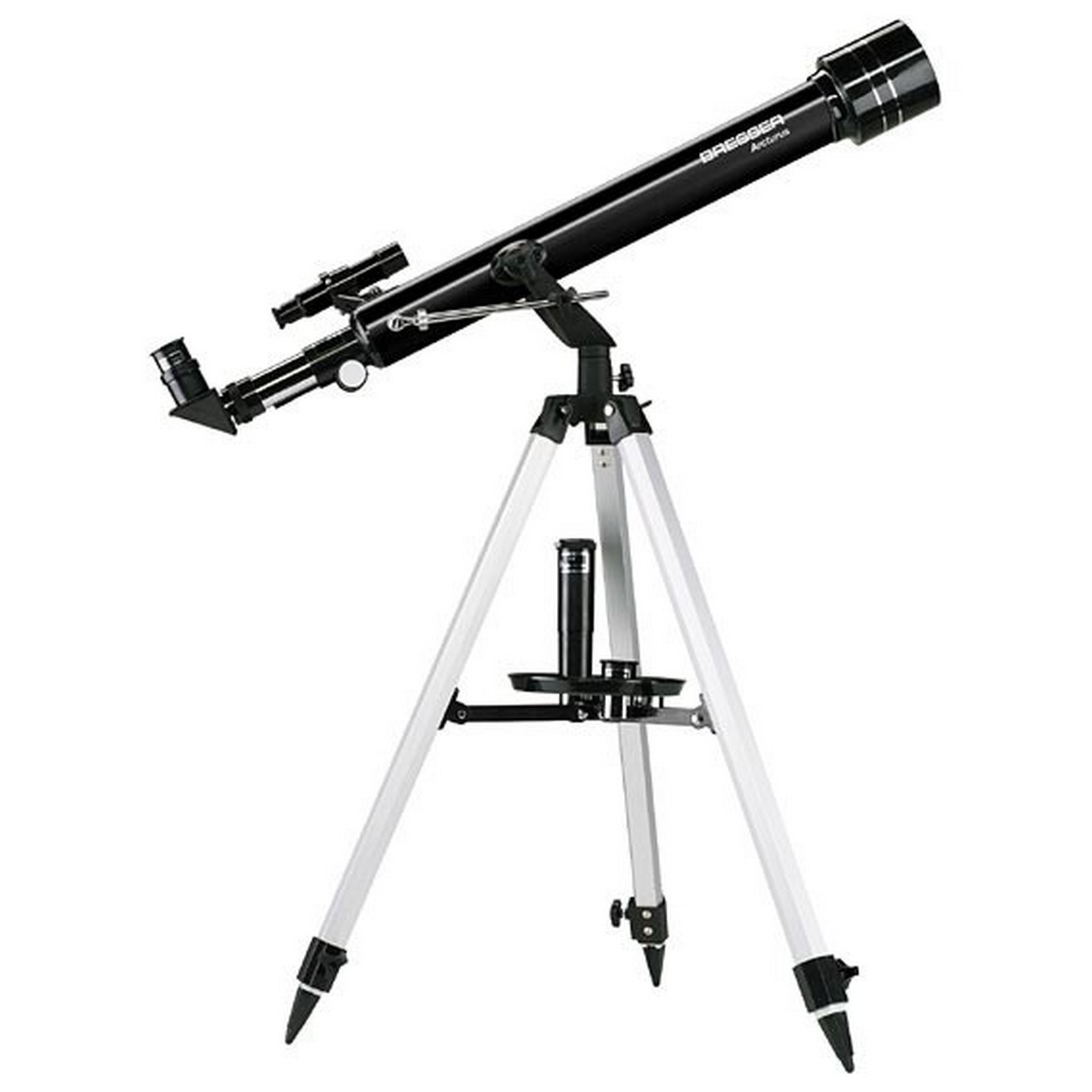 Об'єктив телескопа Bresser Bresser Arcturus 60/700 AZ з кейсом є довгофокусний ахромат, що дозволяє знизити негативний вплив хроматичної аберації на зображення. Лінзи об'єктива виготовлені з оптичного скла і мають покриття, що просвітлює на основі MgF2. Ця модель телескопа дозволить спостерігати величезну кількість деталей на поверхні Місяця, Юпітер і його супутники, кільця Сатурна, фази Венери і безліч інших цікавих об'єктів. Фокусёр стандарту 1,25 дюйма дозволяє використовувати з цим телескопом практично будь-які додаткові окуляри і аксесуари. Телескоп оснащений зручним оптичним шукачем 5х24 для швидкого і точного наведення на об'єкти.