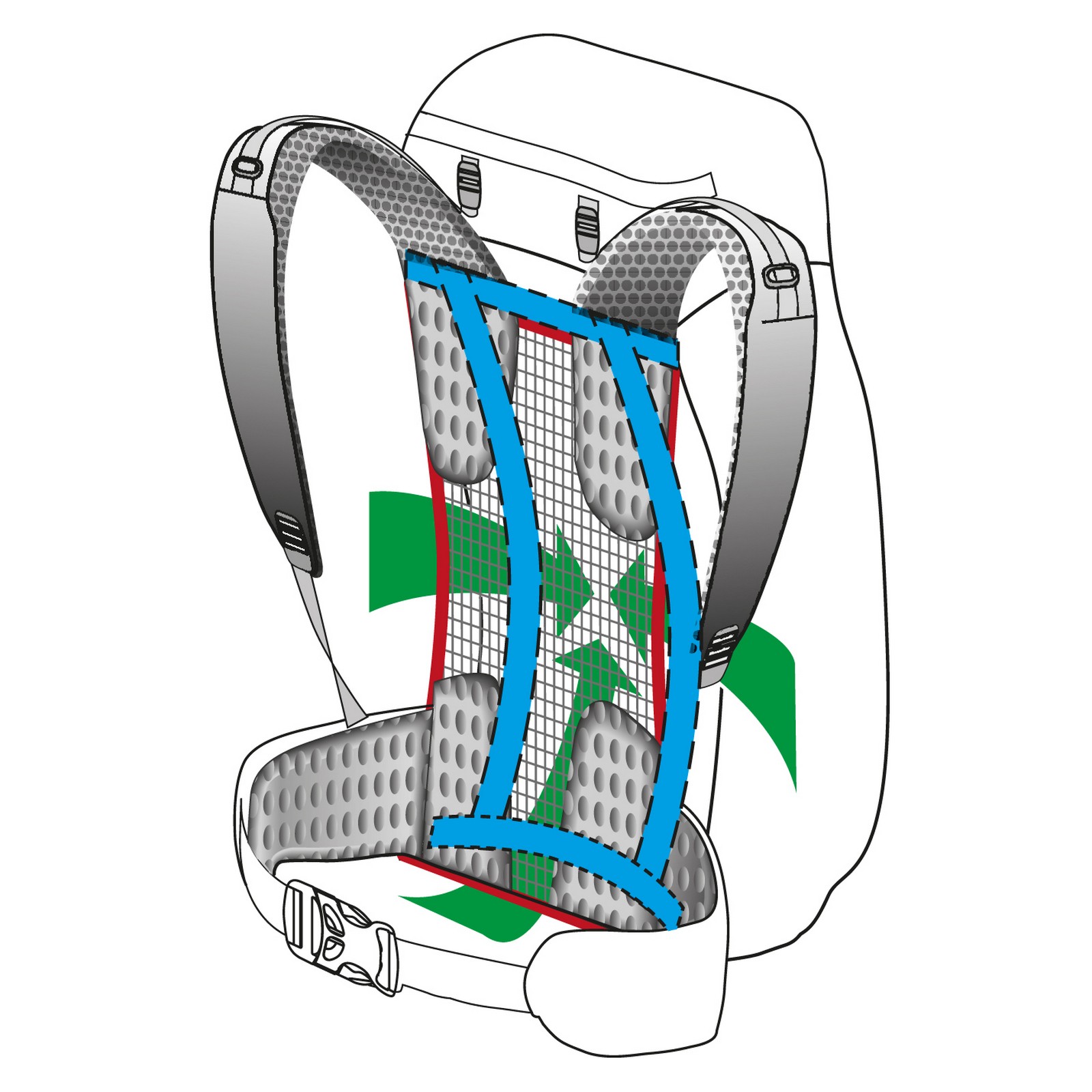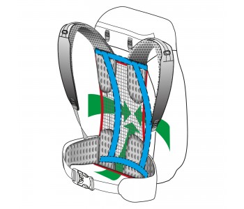 - Спина: завдяки системі Dry Net System Back є максимально вентильованого. Додаткове повітряний простір між спиною і рюкзаком сприяє ефективній вентиляції. Валики з м'якою пенополиуретановой підкладкою обшиті дихаючої сітчастої тканиною.
