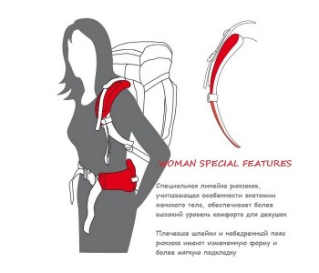 - Плечові шлейки: регульовані по висоті, спеціальної форми, відповідної жіночої анатомії, з м'якою підкладкою з пінополіуретану і EVA-піни, обшиті дихаючої сітчастої тканиною, з еластичними петлями для фіксації патрубка питної системи
