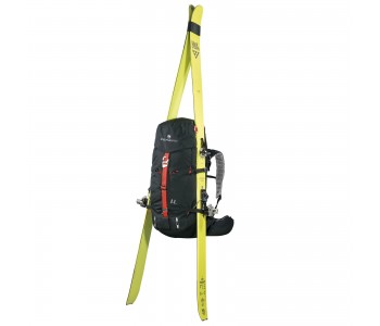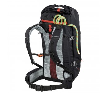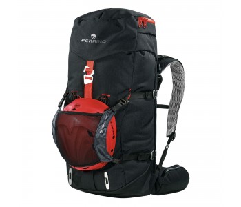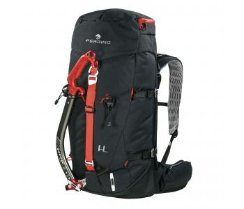 Ferrino XMT 40 + 5 Black наднадійний рюкзак з преміальної лінійки Ferrino HighLab, призначений для активних занять альпінізмом і скелелазінням. Всі рюкзаки Ferrino XMT сконструйовані з упором на максимальну надійність і довговічність, що підтверджується використанням таких матеріалів, як Cordura, застосуванням водозахищеного блискавок YKK і алюмінієвої фурнітури Duraflex. Не дивлячись на те, що рюкзак і сам по собі не важкий, його конструкція дозволяє від'єднати стегнах пояс, верхній клапан, прибрати каркас і тим самим полегшити рюкзак практично вдвічі, доводячи його вага менш ніж до кілограма. Невеликий обсяг рюкзака не завадив його функціональності. Конструкція дозволяє зафіксувати і переносити таке об'ємне спорядження, як лижі, снігоступи, снігову лопату, пару льодорубів і мотузку разом, при цьому залишиться достатньо місця для інших речей. Горловина рюкзака не має стяжки, вона згортається по типу гермомешкі і фіксується фастексами, що виключає намокання речей всередині під час дощу, навіть якщо верхній клапан Відстібнути і рюкзак використовується в полегшеному вигляді. Конструкція зі знімним поясом обумовлена використанням рюкзака разом зі страхувальної системою. Фасад рюкзака має мінімум виступаючих елементів, які могли б за щось чіплятися і заважати пересуванню при проходженні складних маршрутів. З цією метою фасадні петлі і стяжки ховаються в спеціальні отвори, а зовнішні кишені використовуються тільки закриті і розміщуються в верхньому клапані і на поясному ремені. Крім зовнішніх кишень рюкзак має два спеціалізованих внутрішні кишені для питної системи, для снігової лопати, і один загальний кишеню з внутрішньої сторони клапана. Центральна застібка з алюмінієвим гаком дуже практична з точки зору швидкого розстібання рюкзака. Ferrino XMT 40 + 5 Black поєднує простоту і функціональність дизайну, залишаючись надійним рюкзаком для технічно складних спортивно-туристичних активностей.
