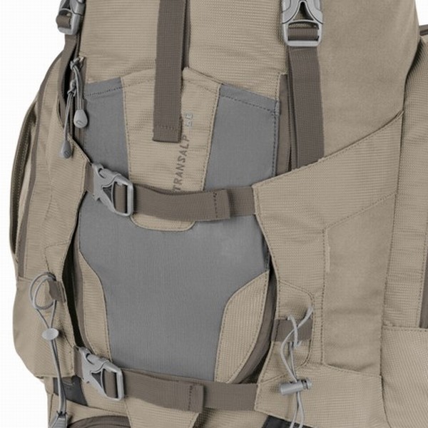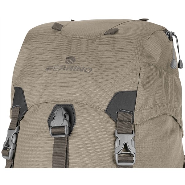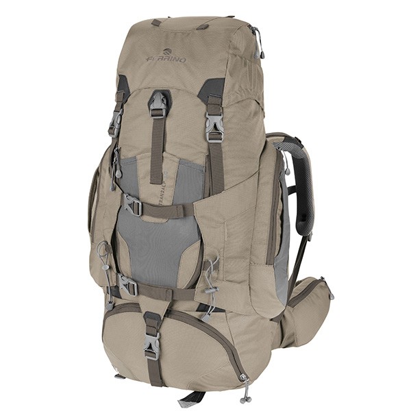 Серія експедиційних рюкзаків Ferrino Transalp відрізняється великим об'ємом і поруч конструкційних рішень підвищують зручність і надійність рюкзака для великої кількості спорядження. Підвісна система з безступінчатим регулюванням має систему подвійної фіксації, стегнах пояс широкий, а плечові лямки мають збільшену товщину пенополиуретановой підкладки для більшого комфорту при максимальному завантаженні. У восьми точках з найбільшим навантаженням рюкзак посилений вставками з міцного матеріалу Hypalon®. Бічні стропи зміщені до центру, об'єднані і подовжені, дозволяючи зафіксувати об'ємну намет або при необхідності навіть ще один рюкзак. Додаткове спорядження можна кріпити за допомогою нижньої стяжки і окремих строп, що поставляються в комплекті. Для палиць і льодорубів є пара окремих кріплень. Речі першої необхідності можна розмістити в десяти кишенях різного об'єму (один на фасаді, чотири з боків, три в клапані і два на поясі). При повному завантаженні стає вкрай важливим наявність двох фронтальних входів, що полегшують упаковку і розпаковування необхідних речей. Усередині рюкзак дуже просторий, нижній відсік відокремлений перегородкою, туди без проблем поміщається великий зимовий спальник. Обсяг верхнього відсіку може варіюватися за допомогою витяжного клапана. Рюкзак повністю адаптований під питну систему. У нижньому потаємній кишені розміщений об'ємний захисний чохол від дощу.
