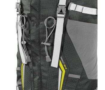 Trekking poles holders (2) - тримачі для трекінгових палиць розміщуються у верхній і нижній частині фасаду Трекінгові рюкзака і, являють собою комбінацію нижніх стяжок з фастексами, що дозволяють змінювати положення на стропі, і верхніх еластичних стяжок з стопери. Такі власники дозволяють надійно фіксувати трекінгові палки і не завантажувати ними внутрішній простір рюкзака. Даний рюкзак має дві пари знімних кріплень для трекінгових палиць, поєднаних з кріпленнями для льодорубів.