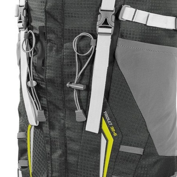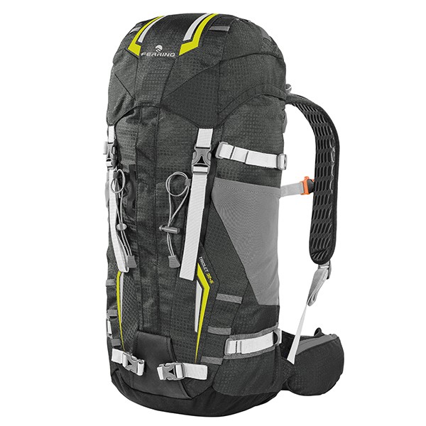 Завдяки застосованим конструктивних рішень і якості матеріалів серія функціональних рюкзаків Ferrino Triolet оптимально підходить для професійного заняття пішим і лижним альпінізмом в будь-який сезон року. Відмінною особливістю даної лінійки рюкзаків є наявність вертикального фронтального входу, за допомогою якого рюкзак розстібається максимально широко і стає зручним для упаковки і швидкого пошуку необхідних речей. При необхідності розмістити більше речей - можна використовувати великий витяжної клапан, регульований зовнішніми стяжками. При необхідності на третину зменшити вагу рюкзака - можна відмовитися від сумного поясу на стегнах і каркаса. Внутрішній простір Ferrino Triolet 32 + 5 Antracite має відділення для питної системи, а в іншому організовано для розміщення альпіністського спорядження. Підвісна система забезпечує зручну посадку рюкзака і вентиляцію спини. Дві кишені в клапані з карабіном для ключів, дві бічні кишені і кишеня на поясі надають достатньо місця для розміщення речей першої необхідності. Для фіксації габаритного спорядження передбачена верхня і бічні стяжки, а також додаткові стропи. Для кріплення льодорубів і трекінгових палок є окремі фіксатори на фасаді рюкзака. Велика кількість петель на рюкзаку допоможе пристебнути за допомогою карабінів будь-яке спорядження в зручному місці. Найбільш відповідальні конструктивні вузли посилені міцним матеріалом Hypalon®.