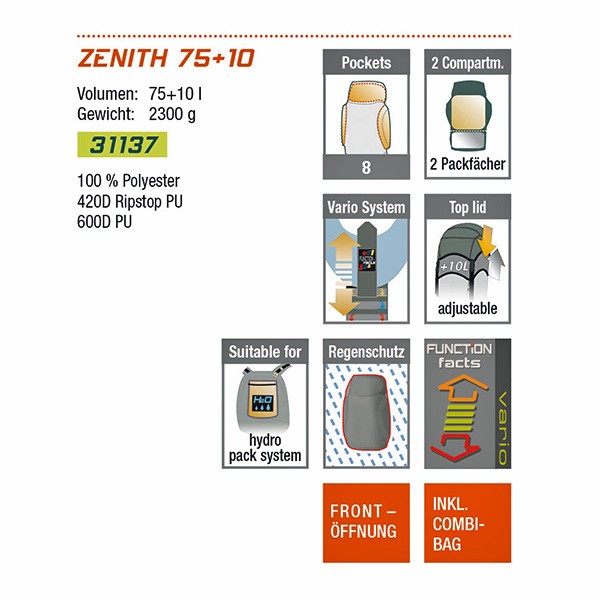 Туристичний, функціональний рюкзак для трекінгу і альпіністського туризму High Peak Zenith 75 + 10. Модель дозволяє з легкістю регулювати корисний об'єм основного відділення від 75 до 85 літрів в залежності від поставлених завдань.