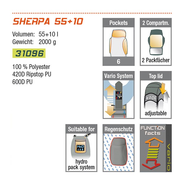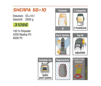 Туристичний, функціональний рюкзак для трекінгу і альпіністського туризму High Peak Sherpa 55 + 10. Модель дозволяє з легкістю регулювати корисний об'єм основного відділення від 55 до 65 літрів в залежності від поставлених завдань.
