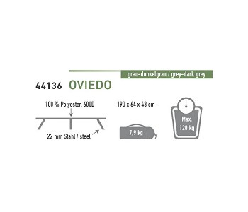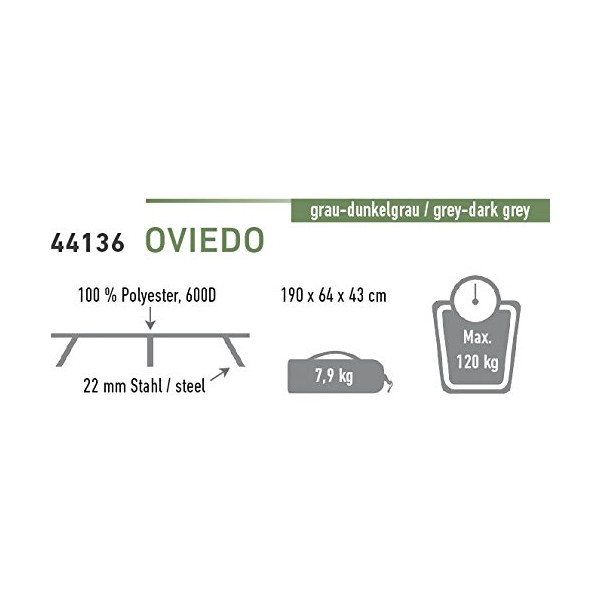 Високоякісна кемпінгові розкладачка High Peak Oviedo подбає про ваш комфортний времяпровождении, де б ви не були будь-то на рибалку, дачі або просто на природі. Завдяки продуманій, жорсткої сталевої конструкції каркаса, розкладачка з легкістю витримує навантаження в 120 кг . Високоякісний і практичний матеріал Oxford прослужить вам вірою і правдою тривалий час.