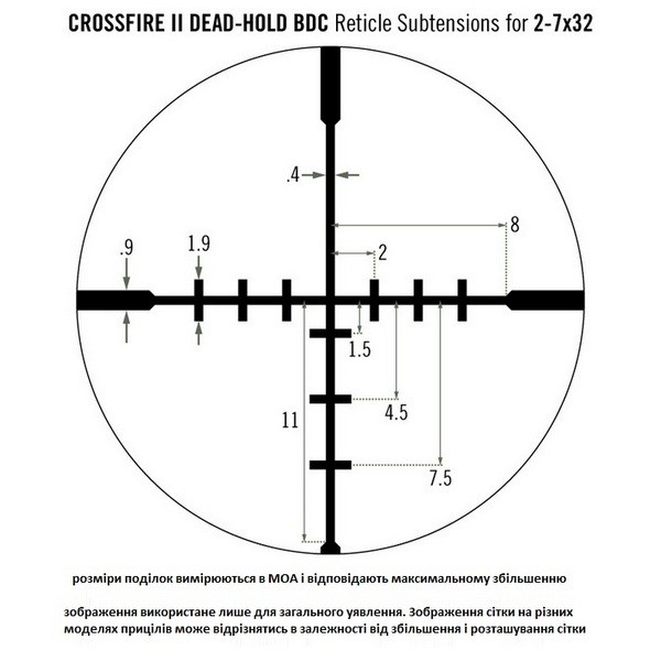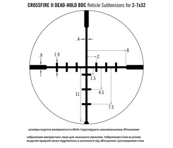 Маючи збільшеною фокусною відстанню вихідної зіниці, механізмом швидкого фокусування Fast Focus, повним багатошаровим просвітленням оптики і обнуляє барабанами введення поправок, даний приціл сконструйований без компромісів і за своїми характеристиками залишає далеко позаду більшість аналогічних моделей в своїй ціновій категорії. Міцний монолітний корпус з авіаційного алюмінію з анодованим покриттям захищений від подряпин, вологи, пилу і запотівання. Універсальна прицільна сітка Dead-Hold BDC дозволяє швидко визначити траєкторію падіння кулі на різних дистанціях і ухвалити необхідні поправки по вертикалі і горизонталі. Приціл Vortex Crossfire II 2-7x32 (BDC) рекомендований для полювання і спортивної стрільби на близькі і середні дистанції з потужного пневматичного, а також нарізної зброї під патрони центрального бою і кільцевого запалення калібру до .308 WIN включно.