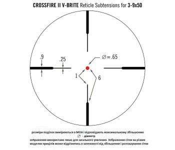 Маючи збільшеною фокусною відстанню вихідної зіниці, механізмом швидкого фокусування Fast Focus, повним багатошаровим просвітленням оптики і обнуляє барабанами введення поправок, даний приціл сконструйований без компромісів і за своїми характеристиками залишає далеко позаду більшість аналогічних моделей в своїй ціновій категорії. Міцний монолітний корпус з авіаційного алюмінію з анодованим покриттям захищений від подряпин, вологи, пилу і запотівання. Центральна точка сітки має підсвічування з 11-ю рівнями яскравості для стрільби в умовах зниженої видимості. Приціл Vortex Crossfire II 3-9x50 (V-Brite IR) рекомендований для мисливців - стрільців на середні дистанції з нарізної зброї патронами центрального бою і кільцевого запалення калібру до .308 WIN включно.