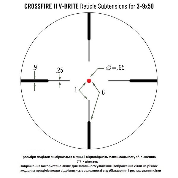 - Підсвічування прицільної сітки: червона, регульована, 11 рівнів яскравості