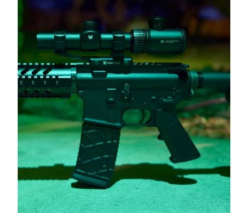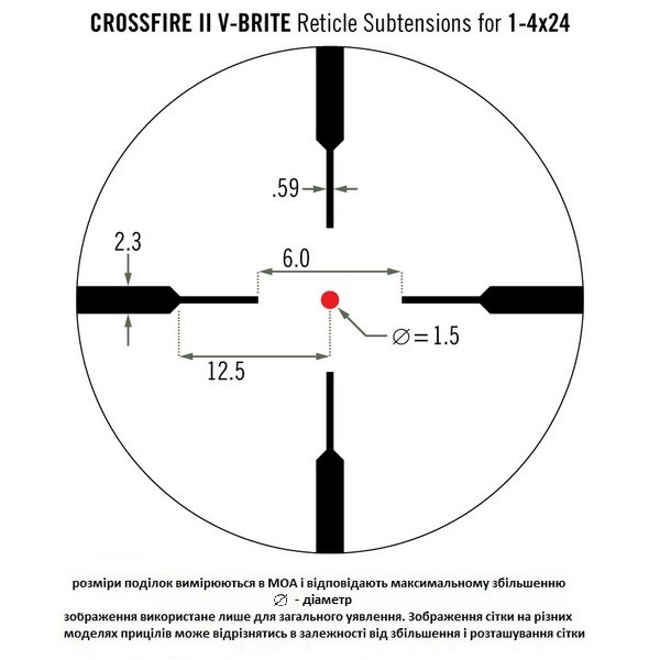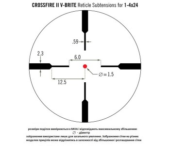 Маючи збільшеною фокусною відстанню вихідної зіниці, механізмом швидкого фокусування Fast Focus, повним багатошаровим просвітленням оптики і обнуляє барабанами введення поправок, даний приціл сконструйований без компромісів і за своїми характеристиками залишає далеко позаду більшість аналогічних моделей в своїй ціновій категорії. Міцний монолітний корпус з авіаційного алюмінію з анодованим покриттям захищений від подряпин, вологи, пилу і запотівання. Центральна точка сітки має підсвічування з 11-ю рівнями яскравості для стрільби в умовах зниженої видимості. Приціл Vortex Crossfire II 1-4x24 (V-Brite IR) рекомендований для загородного полювання, проте з успіхом може використовуватися і для тактичної стрільби.