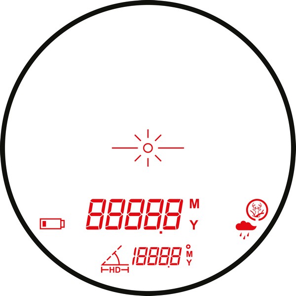 - HD (Horizontal Distance) - для вимірювання дистанції до об'єкта по горизонталі (проекції реальної дистанції на горизонтальну поверхню). Дуже корисно, що в даному режимі одночасно відображається реальна відстань до об'єкта і її проекція на горизонтальну вісь. Такий режим необхідний для обліку траєкторії падіння кулі, при полюванні в горах, коли ведеться стрілянина під великим кутом до горизонту. В цьому режимі відображається піктограма кута з написом HD