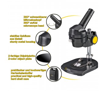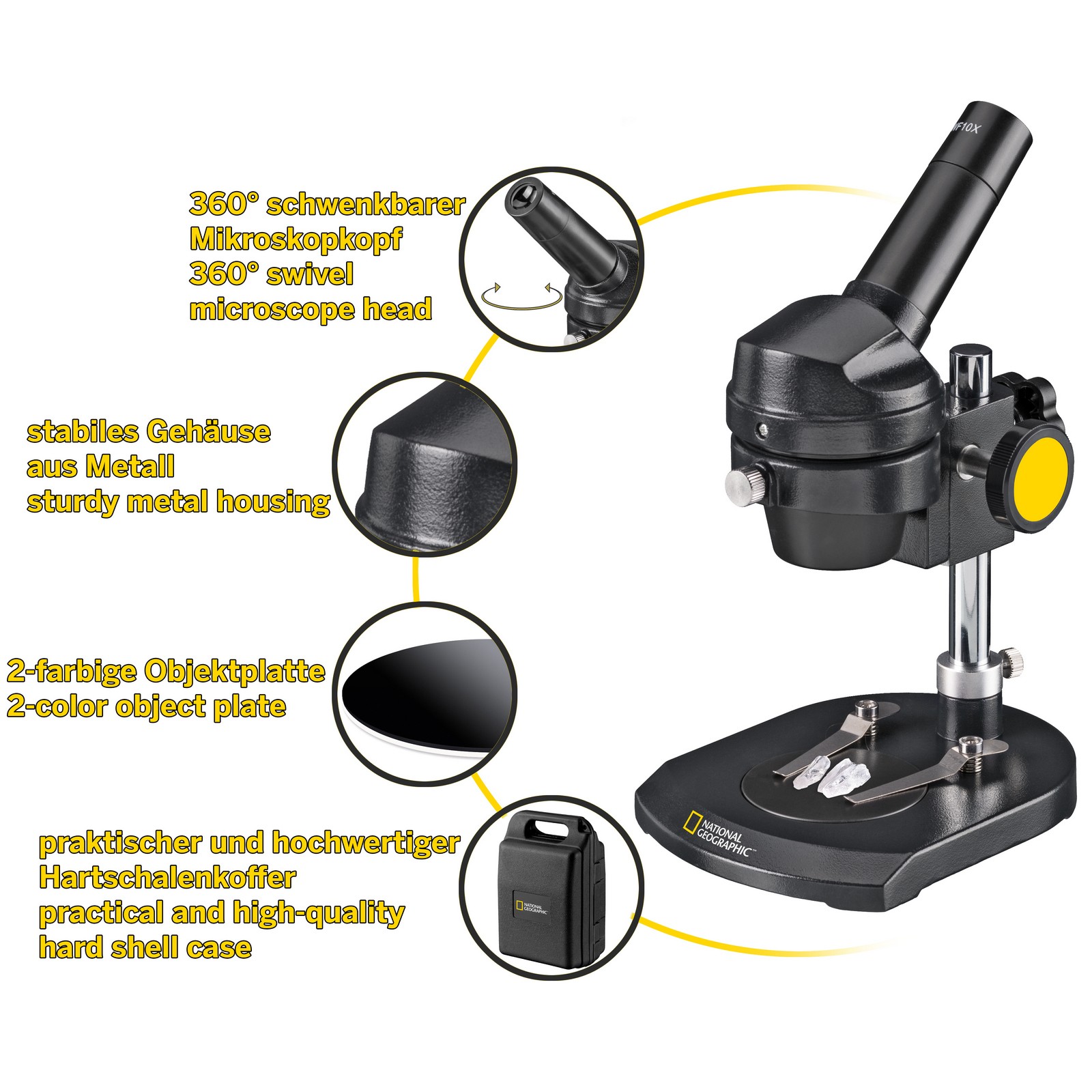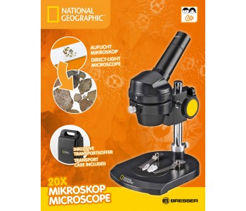 Перший монокулярний стереоскопічний мікроскоп призначений для дітей і підлітків може дати фору багатьом подібним спеціалізованим мікроскопів, завдяки великому діапазону робочого ходу, стійкого металевого корпусу і механічних вузлів, виконаних з металу. Крім того, мікроскоп поміщений в спеціальний пластиковий захисний кейс, що навряд чи можна зустріти серед приладів подібного рівня. Мікроскоп National Geographic Mono 20x (з кейсом) забезпечує об'ємне стереоскопічне зображення і має широке застосування в таких областях як мінералогія, ентомологія, ботаніка, нумізматика, ремонтні роботи та ін.
