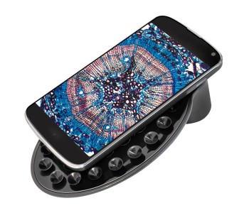 В комплектацію входить адаптер для камери смартфона (планшета). Адаптер кріпиться на тубусі мікроскопа і дозволяє проводити фото і відеозйомку основний або фронтальною камерою гаджета. Гладка тильна сторона смартфона надійно кріпиться за допомогою безлічі присосок адаптера (в разі рифленою тильній поверхні смартфона рекомендується використовувати фронтальну камеру).