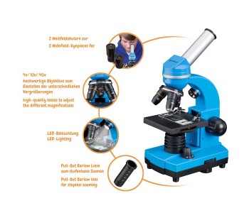 Дана модель поставляється в чотирьох різних кольорах. Широкий набір аксесуарів, об'єктивів і окулярів, необхідних для старту спостережень, що дає можливість відразу зануритися в настільки цікавий і захоплюючий мікросвіт.