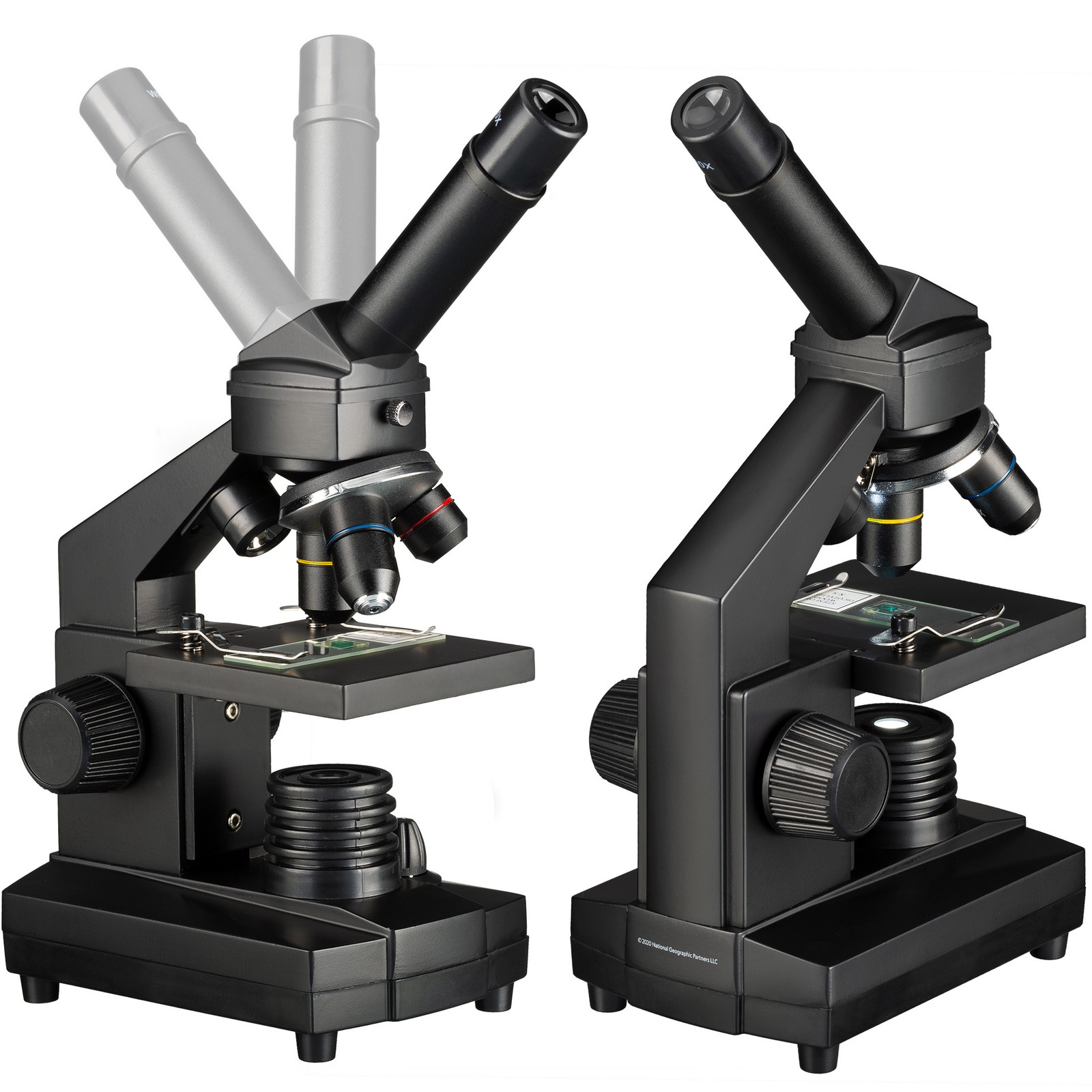 монокулярн насадка, нахилена під кутом 45 °, повертається на 360 °, дозволяючи спостерігати в будь-якому зручному положенні, а також працювати з мікроскопом групі дітей або дорослих без переміщення мікроскопа в просторі.